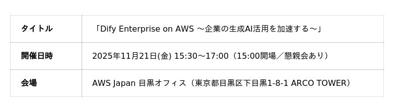 株式会社LangGeniusは、企業の生成AI活用をテーマとしたイベント「Dify Enterprise on AWS ~セキュアなデータ活用とパートナー導入事例~」 を開催いたします。