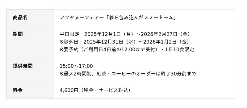 12月から翌年2月までご提供するアフタヌーンティーは、「夢を包み込んだスノードーム」がテーマです。 柔らかな光と香りに包まれ、まるでスノードームの中に迷い込んだかのような幻想的な世界観でお届けします。