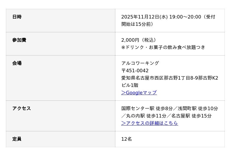 2025年11月12日(水) に、名古屋市のアルコワーキング(運営会社:室屋アフィリエイト合同会社、所在地:愛知県名古屋市西区那古野、代表:室屋清隆)にて、「交流会の名刺交換術セミナー」が開催されます。
