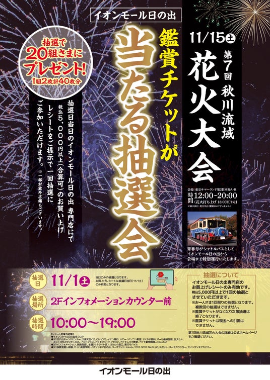 イオンモール日の出専門店のお買い上げレシート5,000円(税込)以上で青春号による送迎付き鑑賞チケットが当たる抽選会にご参加いただけます。