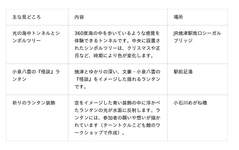 焼津の海と夜空の輝きをイメージした「光の海中トンネル」や「シンボルツリー」、小泉八雲の『怪談』をイメージした揺れるランタンなどを設置します。マリンブルーを基調としたきらびやかな光で彩り、回遊性を向上させます。