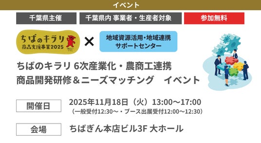 イベント名: ちばのキラリ×地域資源活用・地域連携サポートセンター 令和7年度 商品開発研修&ニーズマッチングイベント開催日時: 2025年11月18日(火) 13:00~17:00(受付開始:12:00)