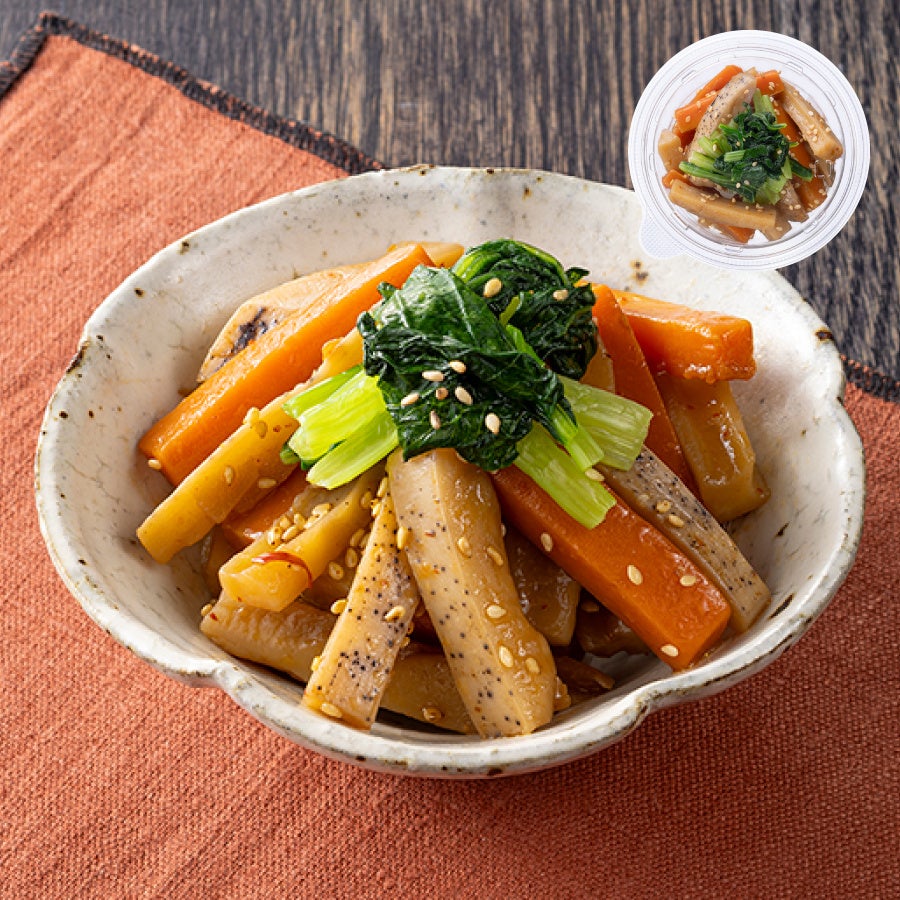 皮つきのれんこんを大きくカットし、アクセントに赤唐辛子を効かせたやみつきになる味わい。シャキシャキとした食感と見た目のインパクトのある一品です。