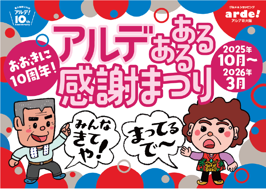 2025年10月から2026年3月までの毎月、ご利用のお客様にお楽しみいただける企画を実施してまいりますので、この機会にぜひ、10周年を迎えた「アルデ新大阪」で、グルメ&ショッピングをお楽しみください!