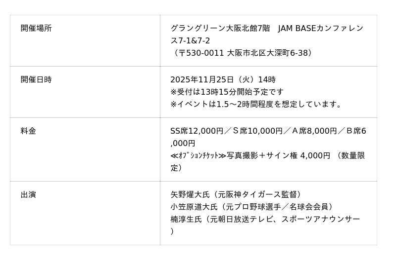特定非営利活動法人THANKYOU FUND(サンキューファンド)(本社:大阪府枚方市川原町12番1号マルエスマンション川原町101号室/代表理事:矢野輝弘)は、「(チャリティ・トークショー)ヒトを育む“オレ流”チームマネジメント」を2025年11月25日(火)14時から開催します。プロ野球界の2人のレジェンドOBが夢の初競演!「ヒトを育むチームマネジメント」について2人が熱い想いを語ります!
