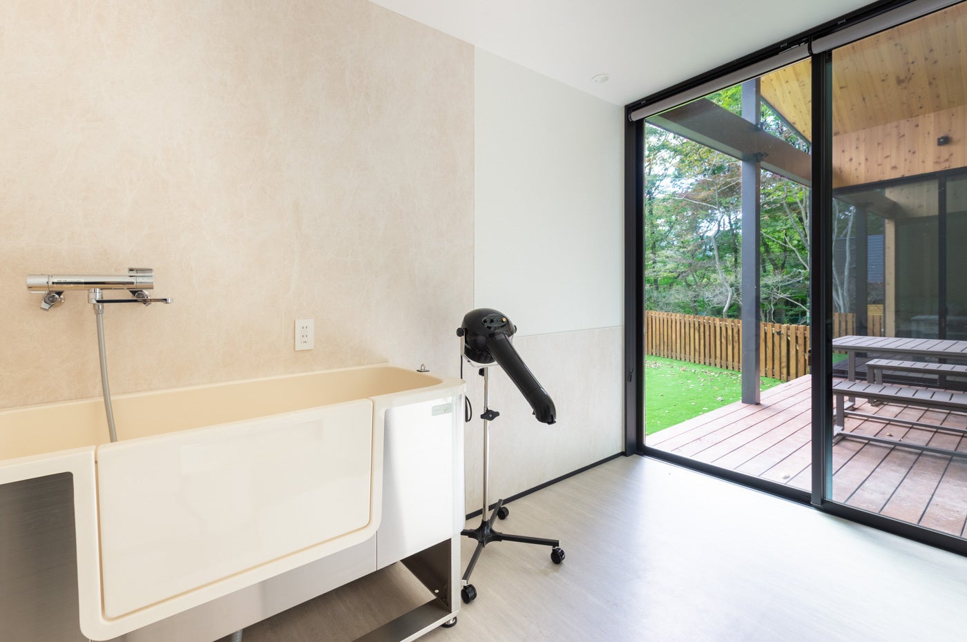 室内にはわんちゃんを洗えるトリミングルームを備え、ドライヤー台・シンク・専用温水を完備。