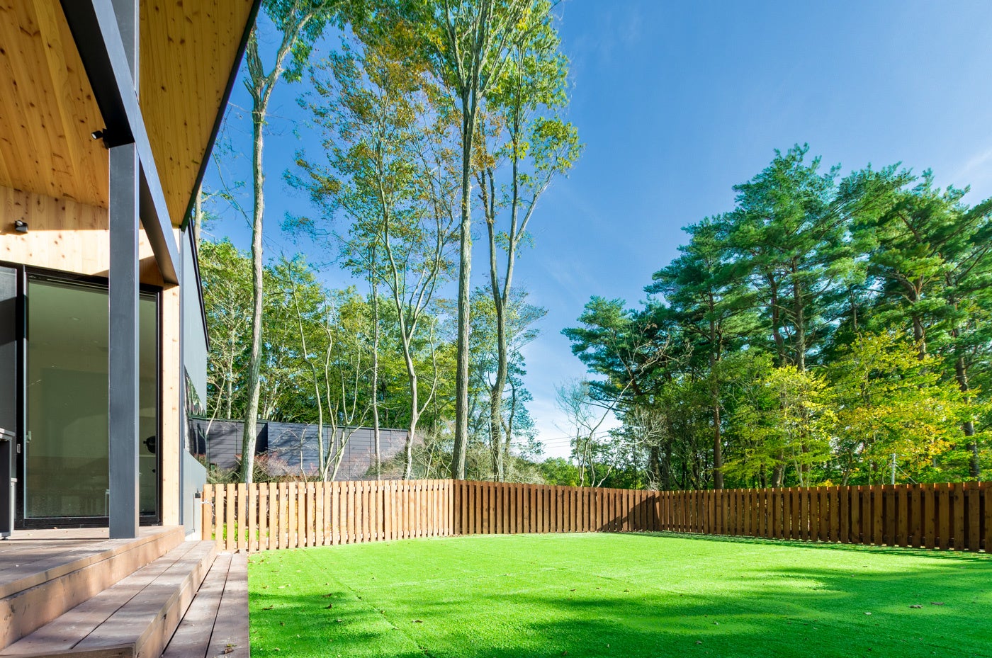 南向きの大開口リビングからつながる約100平方メートル の広々としたプライベートドッグラン(人工芝)は、柵付きで安心してノーリードで遊べる空間。
