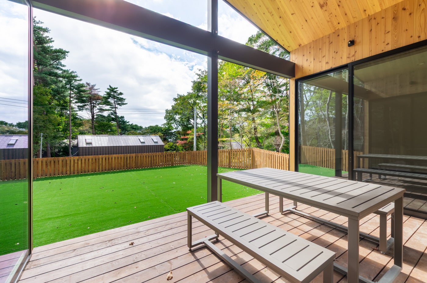木々に囲まれたウッドデッキ上を、わんちゃんが思いきり走り回る姿を楽しめます。