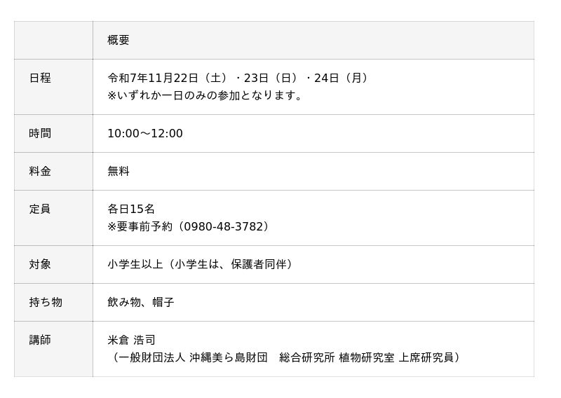 海洋博公園では、「植物観察会~植物博士と公園を歩く~」を開催します。植物博士の米倉浩司さん(一般財団法人 沖縄美ら島財団 総合研究所 植物研究室 上席研究員)を講師にお招きし、海洋博公園内に生育している植物の観察会を行います。