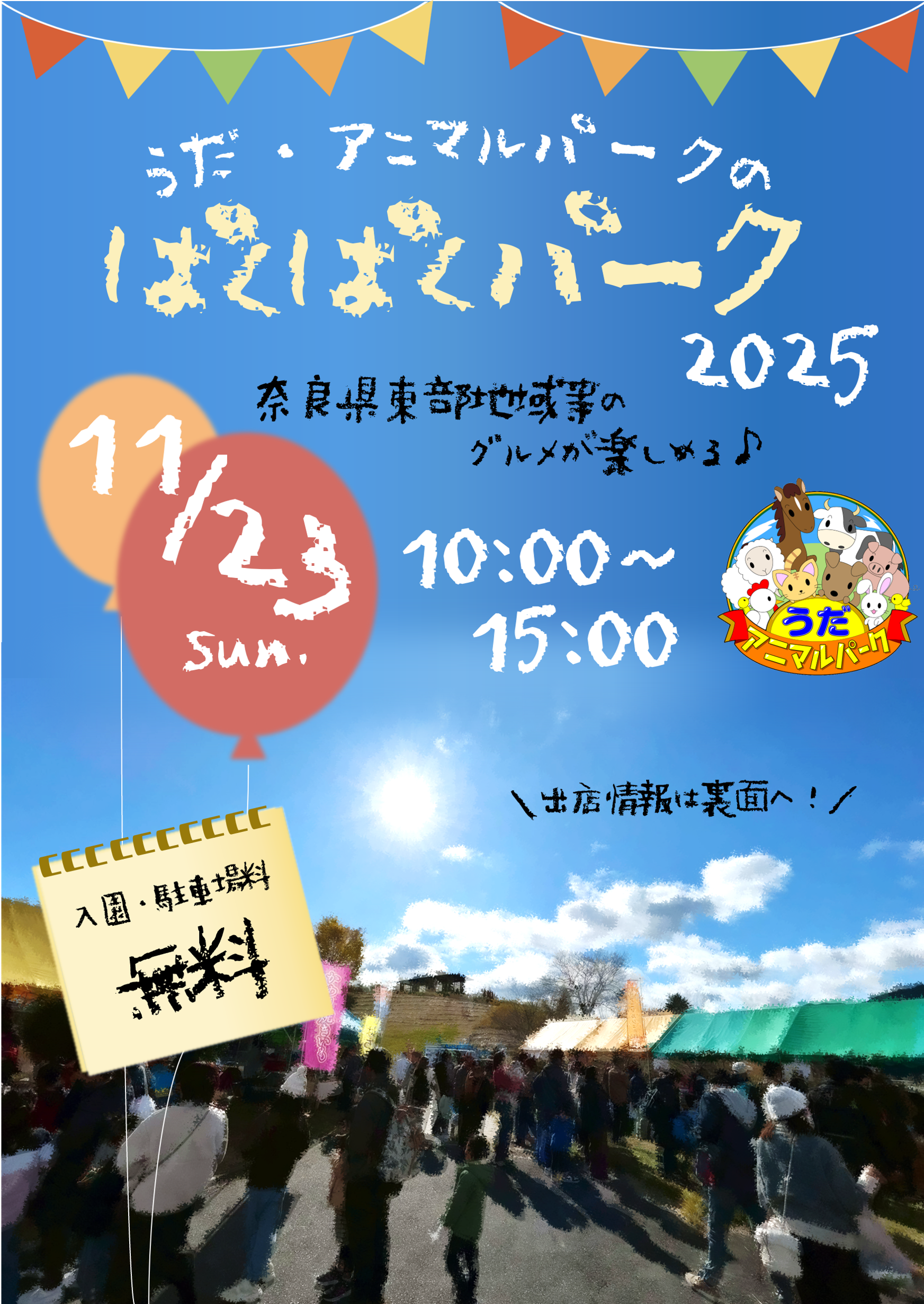昨年度に引き続き、食のイベント「うだ・アニマルパークのぱくぱくパーク2025」を下記のとおり開催します。