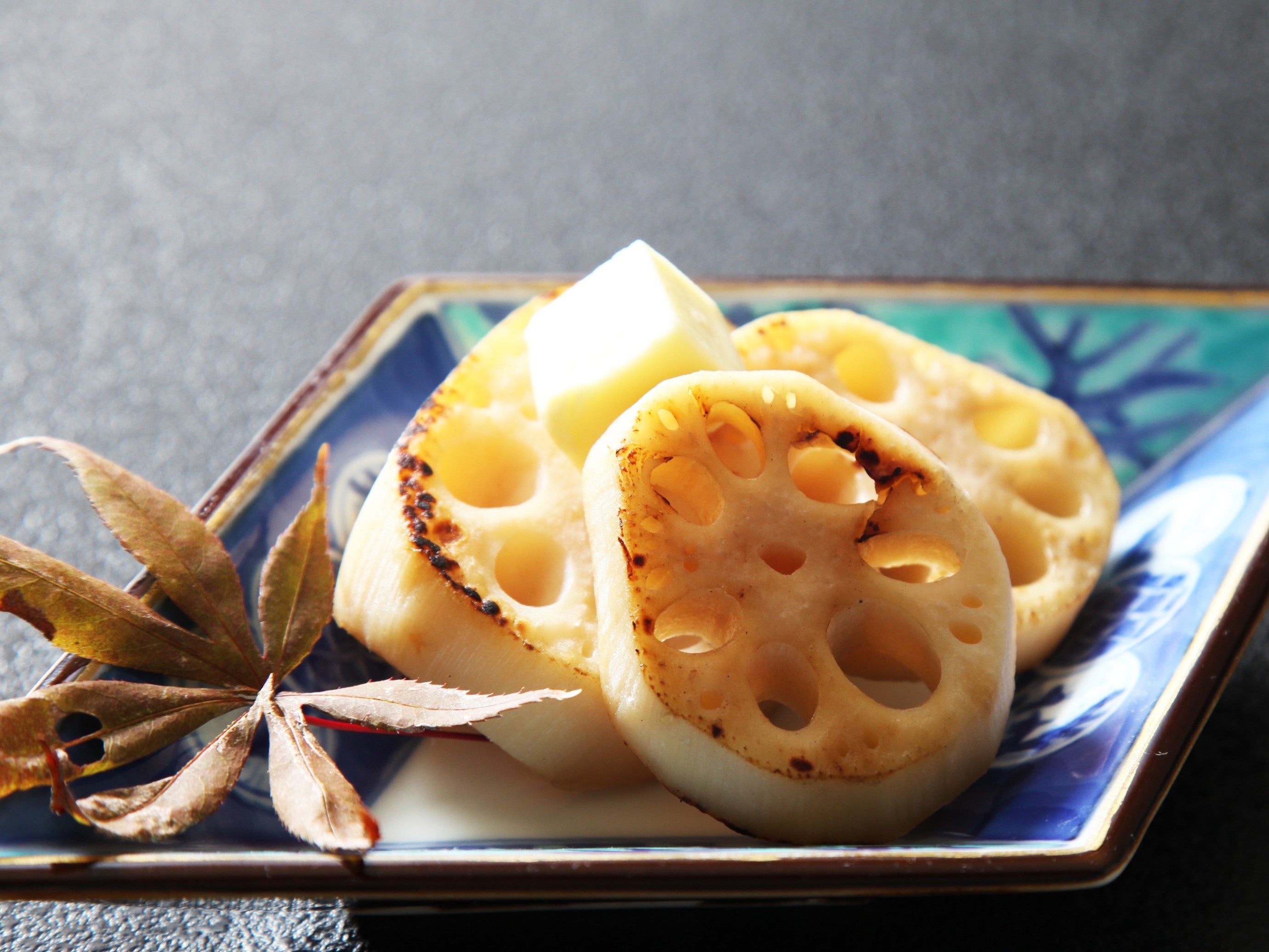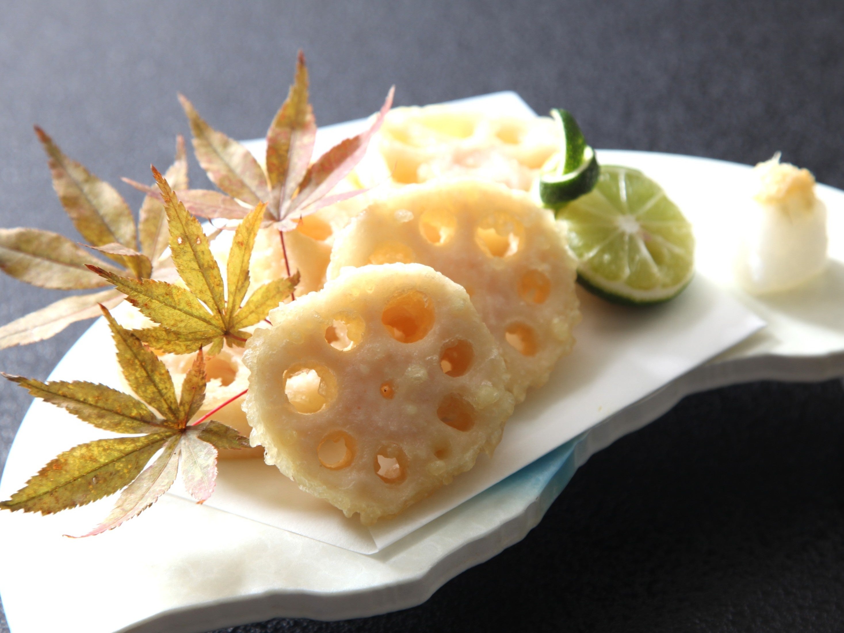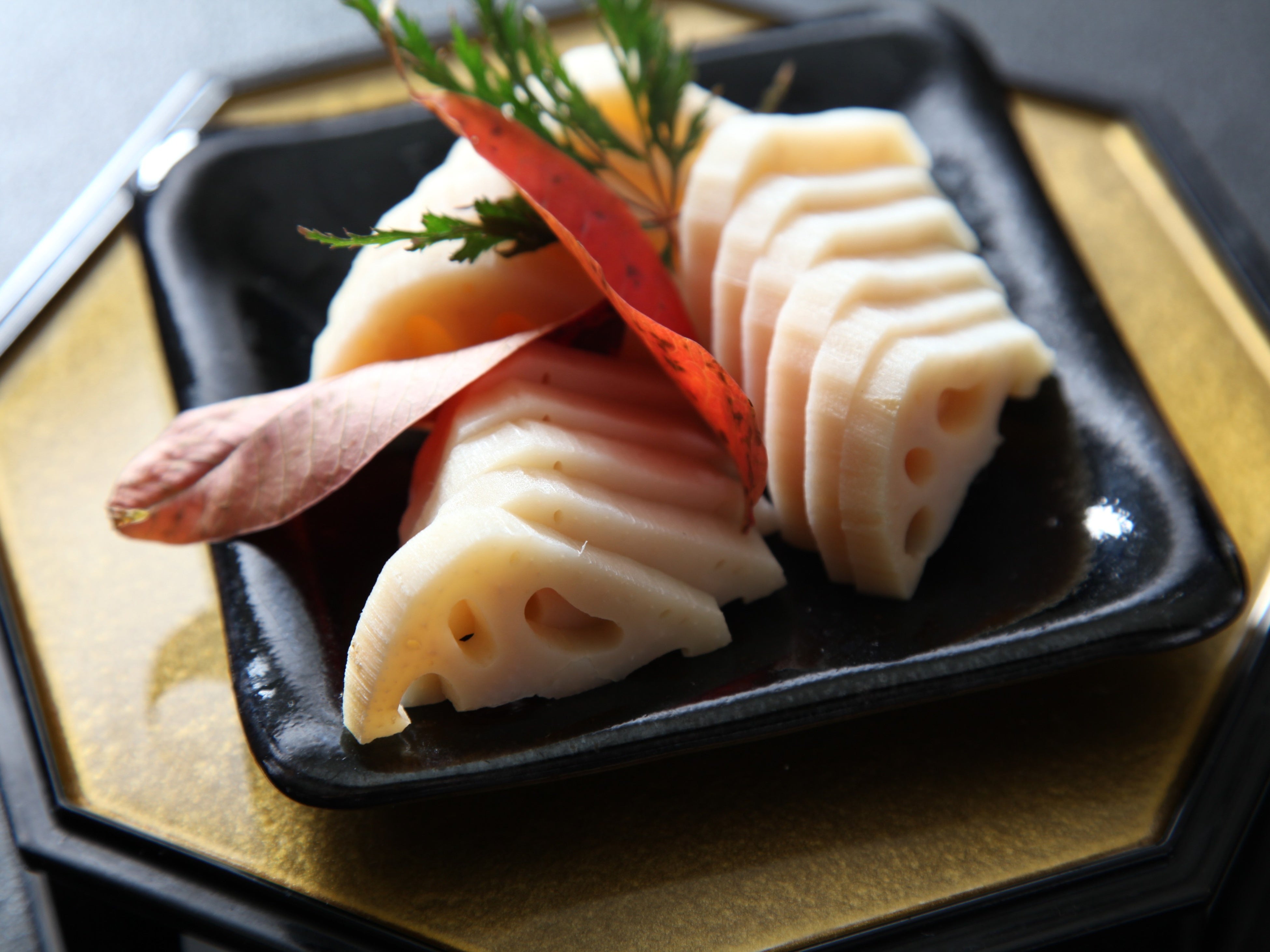 ・会席コース内:蓮根きんぴら、蓮根饅頭きのこ餡掛け、蓮根のすだち酢漬け