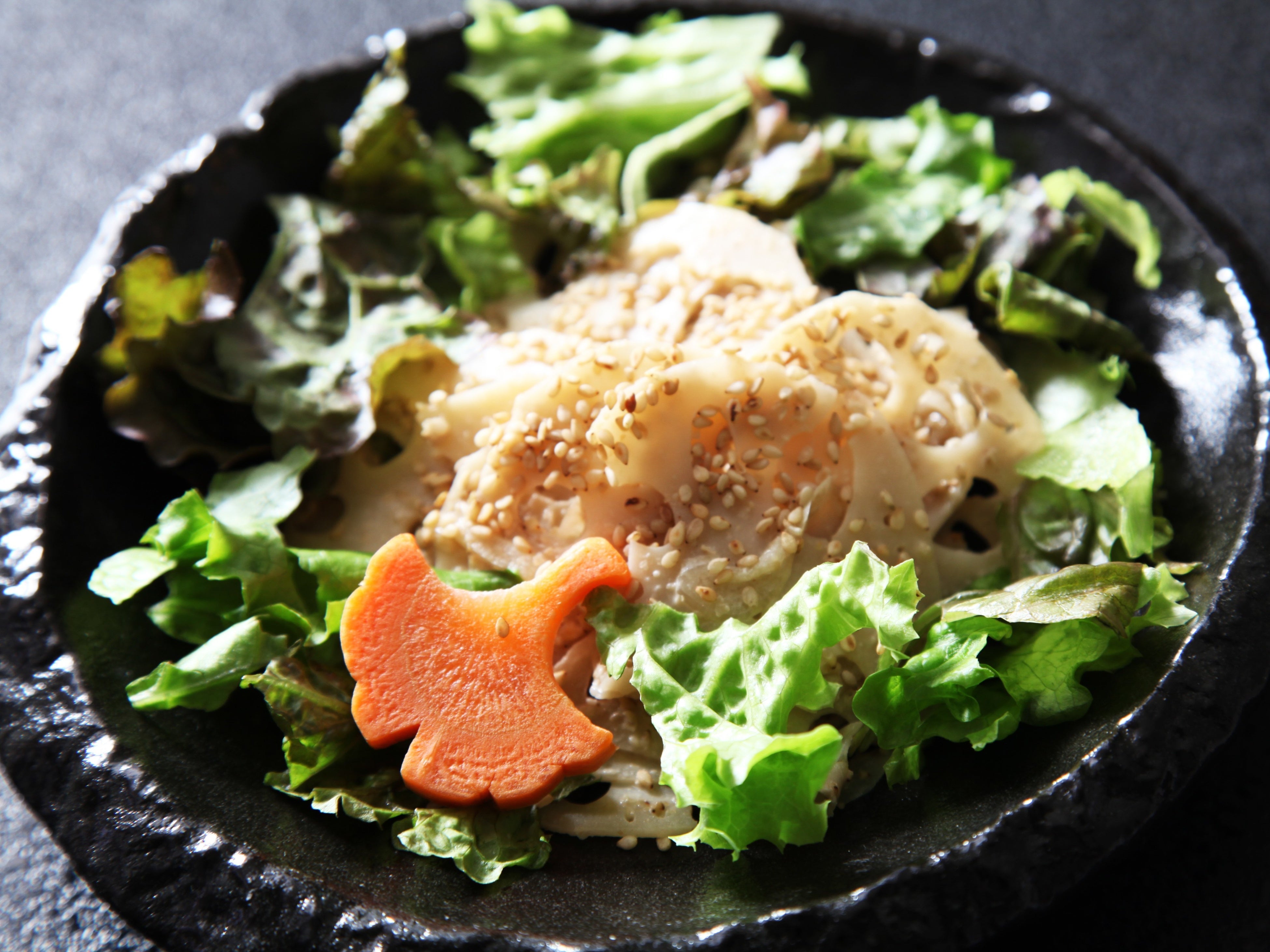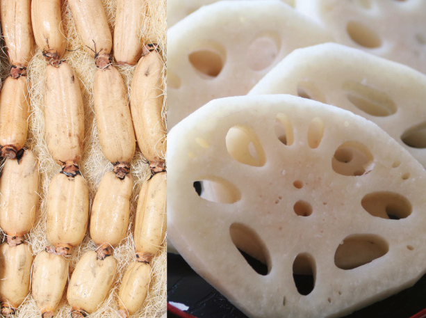 ・蓮根サラダ、蓮根煎餅、蓮根ステーキ、蓮根天麩羅、蓮根飯、蒸し蓮根