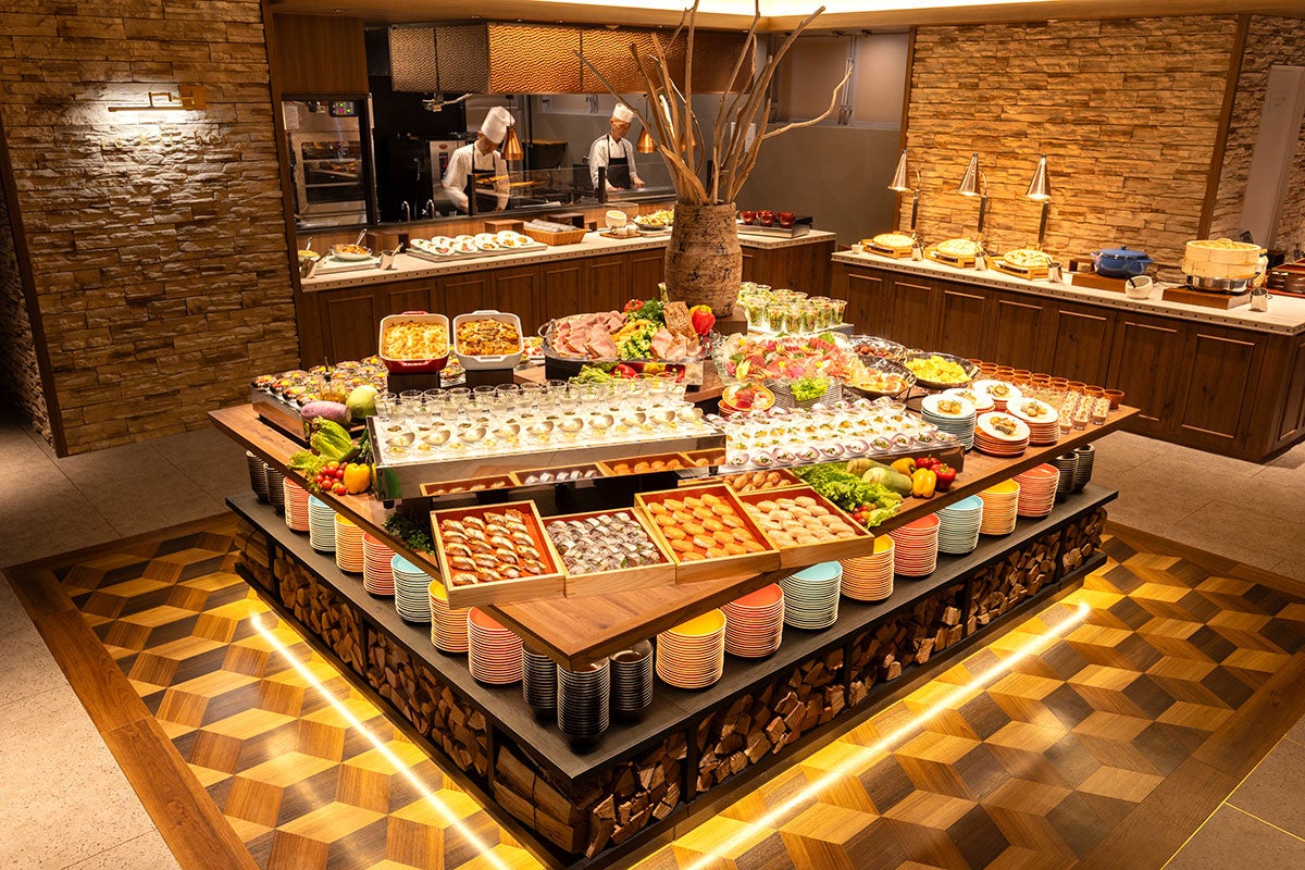 お食事メニューは箱根エリア周辺の食材を最大限に活かし、山と海の幸を味わう創作料理をお楽しみいただけます。ライブキッチンでは、ローストビーフや海鮮鉄板焼き、沼津みかんのクレープシュゼットを目の前で仕上げます。夕食時は箱根の銘柄豚である箱根山麗豚と白葱の緑茶蒸しや、神奈川名物サンマーメンをご用意。朝食にはライブキッチンでご提供する切りたて鎌倉ハムに、相模の赤玉子のオムレツ、小田原おでんなど、夕朝食ともにご当地グルメもお楽しみいただけます。