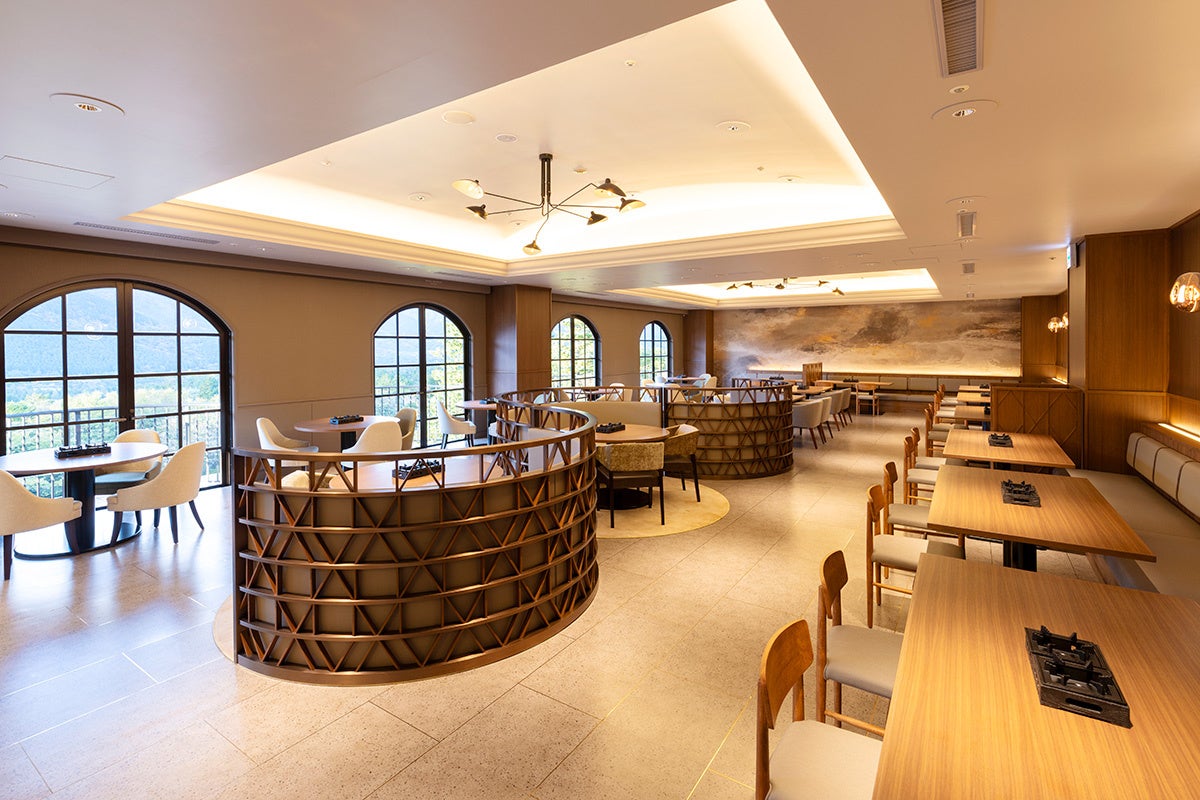 日本の伝統工芸品である寄木細工を取り入れた、伝統とモダンが調和したレストランでは窓からは雄大な箱根の景色を眺めながら、ゆっくりとお食事を味わっていただける空間となっております。