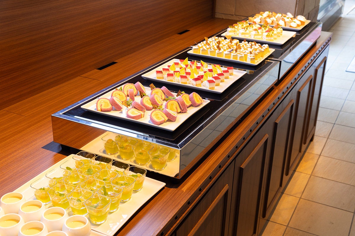 ホテルでのご滞在をより満喫していただけるよう、ラウンジでは朝昼夜と異なるスイーツバイキングをご提供いたします。まず、チェックインの1時間前から夕食前までご提供している「アフタヌーンティー」では、いちごショートケーキなど、華やかな生菓子をお楽しみください。