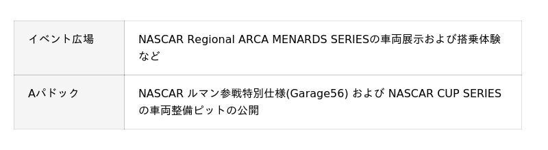 イベント広場やパドックエリアでは、NASCARマシンや北米モデル車両の展示など、アメリカンモータースポーツを体感できるブースが登場!