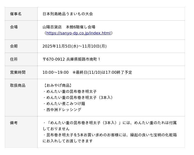 元祖博多めんたい重株式会社は、2025年11月5日(水)から10日(月)までの6日間、山陽百貨店(姫路市)本館6階催し会場で開催される「日本列島絶品うまいもの大会」に、この度初めて出店いたします。