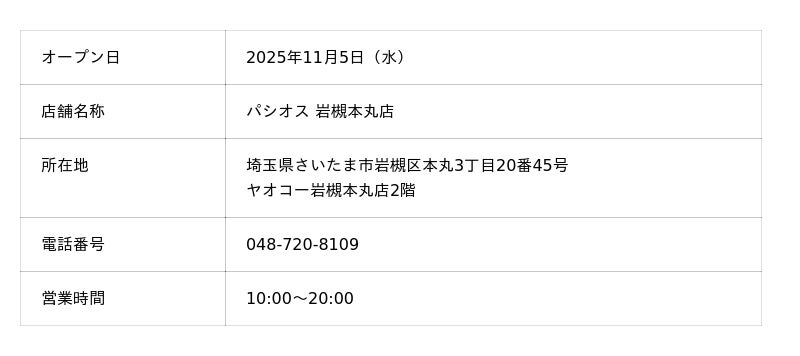 株式会社田原屋(本社所在地:神奈川県川崎市、代表取締役会長:田熊 太郎、代表取締役社長:甲斐 直裕)は、2025年11月5日(水)さいたま市岩槻区の「ヤオコー岩槻本丸店」内に、「パシオス 岩槻本丸店」をオープンいたします。岩槻エリアには約2年ぶりの出店となります。