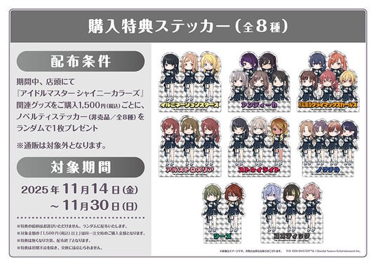 期間中に店頭にて『アイドルマスター シャイニーカラーズ』関連グッズをご購入1,500円(税込)毎に、ノベルティステッカー(全8種)を1枚ランダムでプレゼントいたします。
