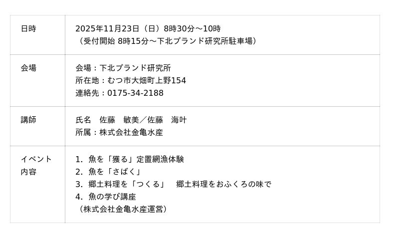 一般社団法人 海のごちそう推進機構と株式会社金亀水産は、魚を実際にさばくこと、地域の海洋変化や魚種の変遷を学ぶこと、さらに地域の郷土料理に根差した調理体験など、日本の豊かな海の食文化を継承し輪を広げる取り組み「日本さばける塾 in むつ市大畑」を11月23日(日)に開催いたします。