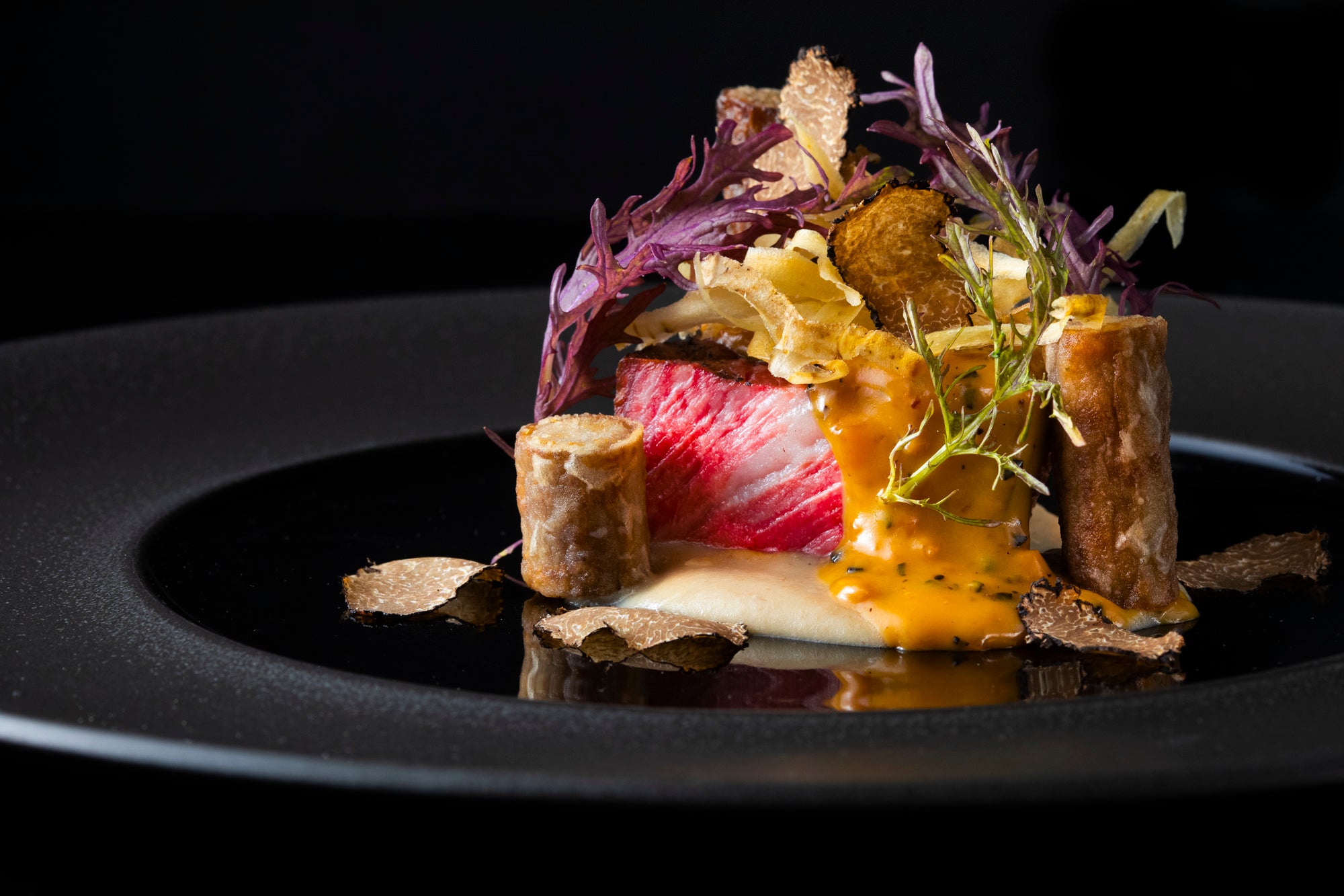 メインディッシュは、A5ランク佐賀牛サーロインのグリル。芳醇なトリュフの香りと香ばしくソテーしたゴボウの風味、ほのかなメープルの甘みが絶妙に調和し、力強さと繊細さを併せ持つ冬のメインディッシュに仕上げました。