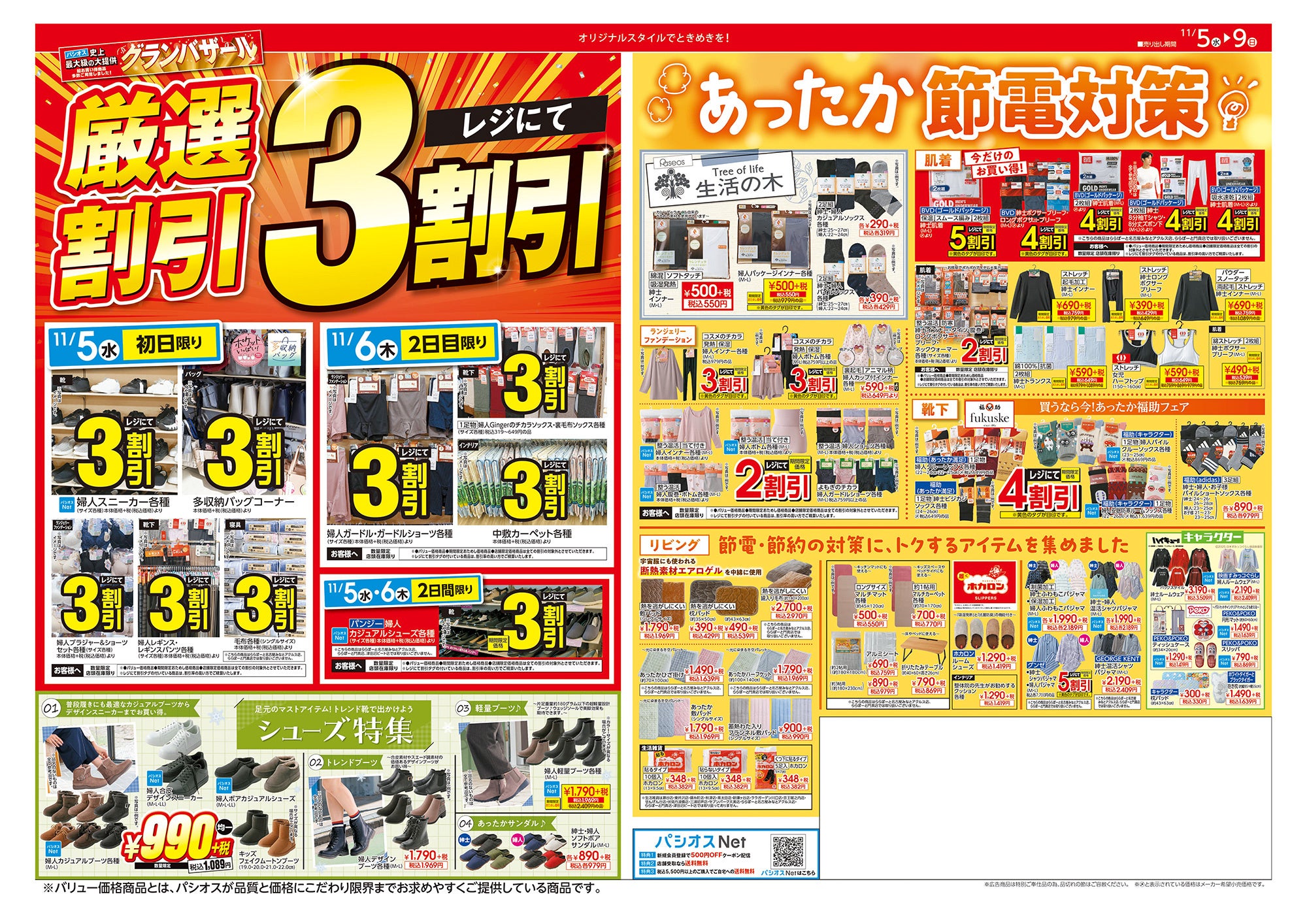 特別企画11/5(水)限りの[タイムサービス]や、グランバザール特別価格の[均一価格セール]を開催。