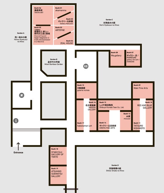 三方を特徴的な庭園に囲まれた和室(書院)には6軒の出展者が展示を行います。アートフェア初出展となる群馬のakamanmaは、角偉三郎の菩薩桶や黒田泰蔵の晩年の名品など、厳しい目で選び抜かれた作品を展示します。ギャラリー北欧器は、ミッドセンチュリーの陶芸作家3名(ヴィルヘルム・コーゲ、ベルント・フリーベリ、スティグ・リンドベリ)のグループ展を行い、また鎌倉の瀧屋美術は、難波田龍起や、岡本太郎など近代洋画と古美術を組み合わせた展示を行います。その他には、ARTDYNE、ZEAL HOUSE、企画展示として超適応2:新しい時代の工芸と表現のプレゼンテーションをお楽しみいただけます。