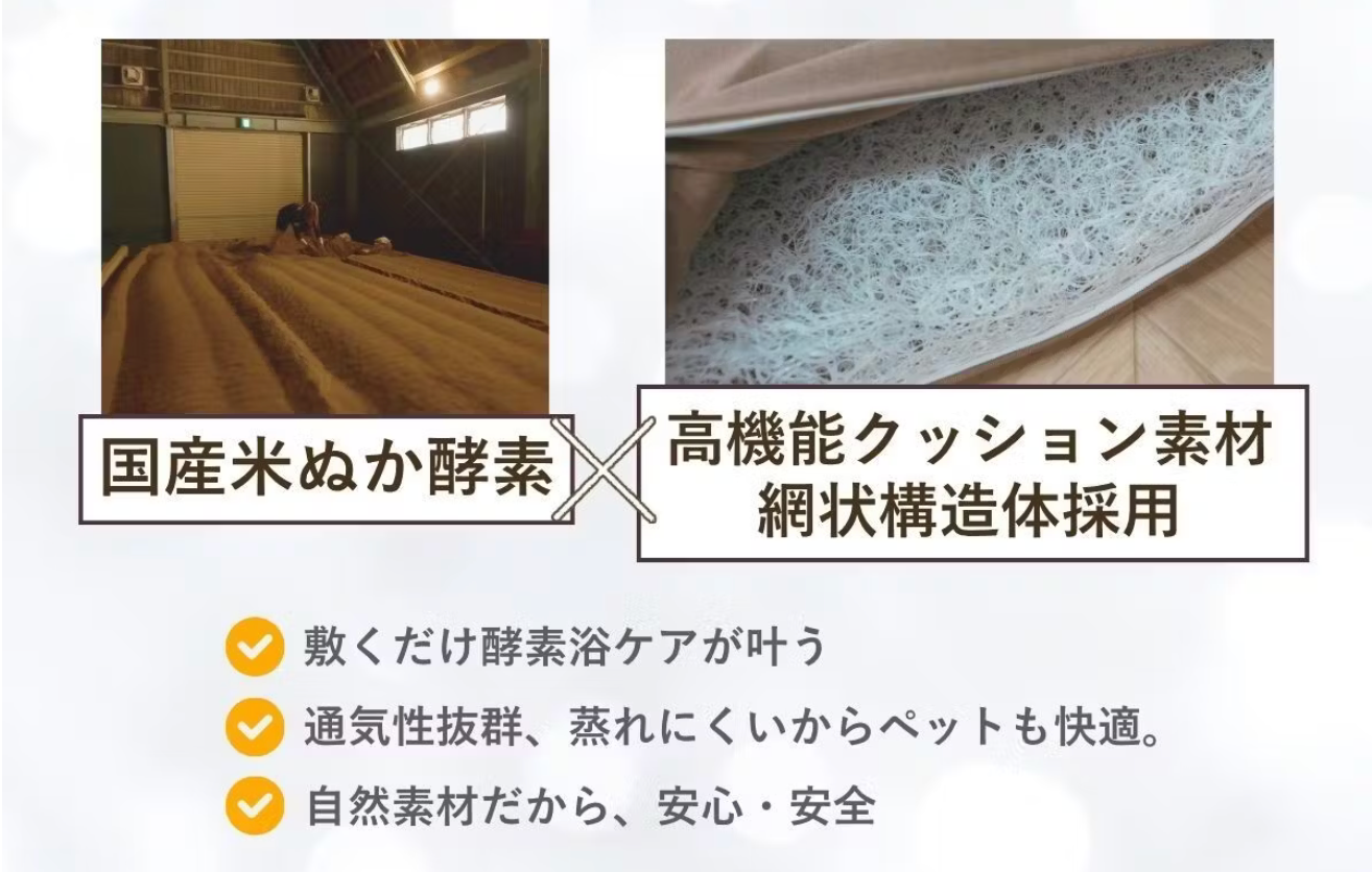 このマットは、国産米ぬか酵素 × 高機能クッション素材(網状構造体)を採用しています。