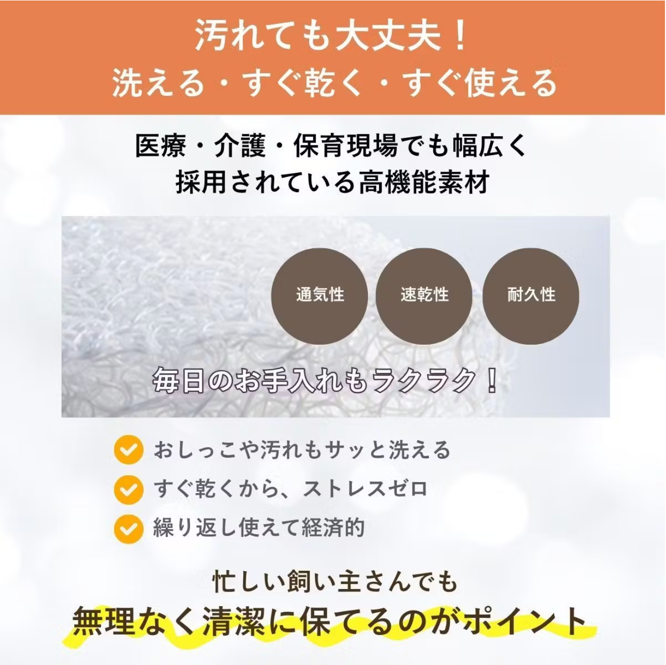 通気性・速乾性に優れた網状構造体を採用。清潔を保ちながら、ペットが安心してくつろげる毎日を支えます。