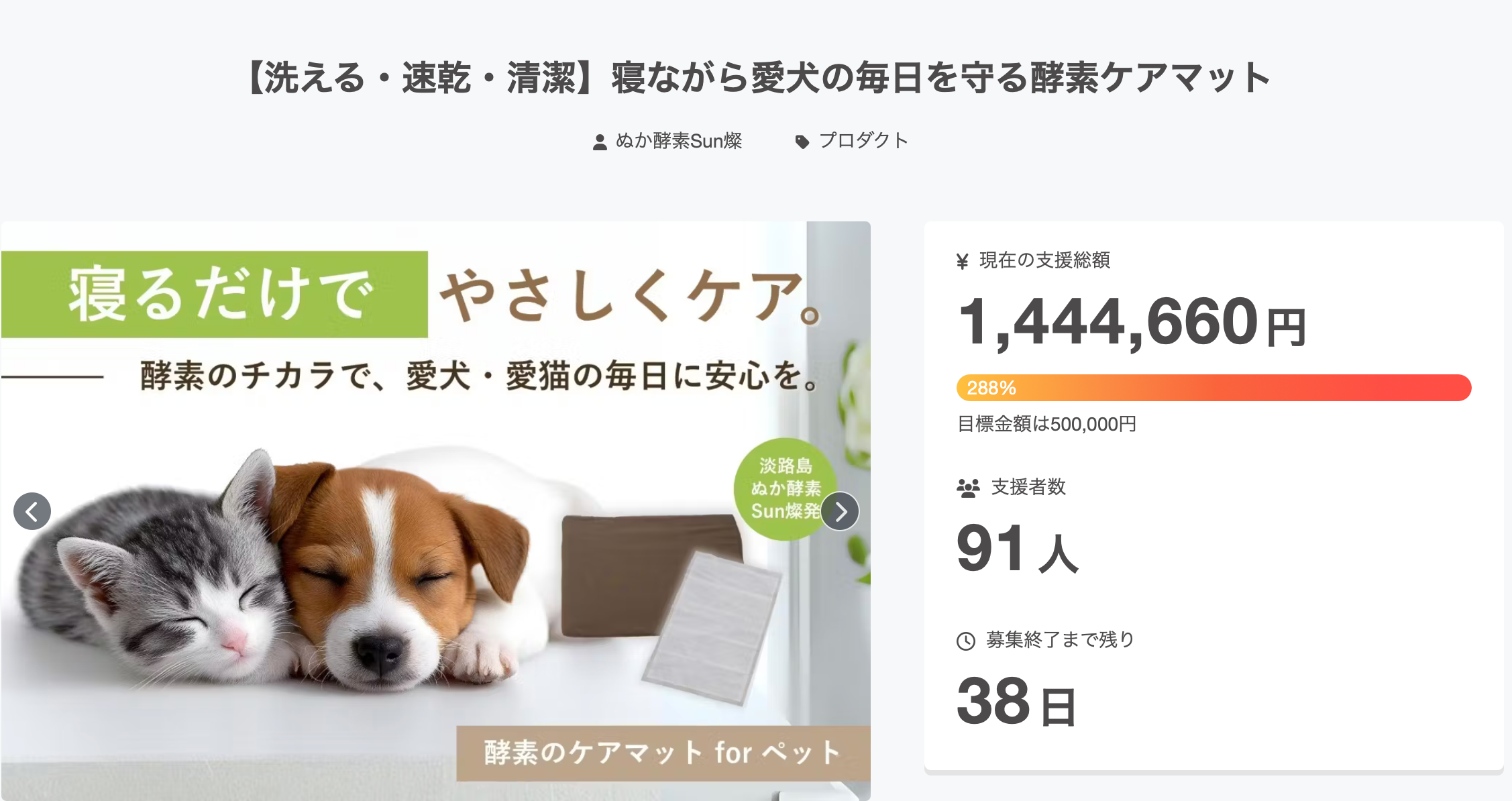 淡路島で米ぬか酵素風呂「ぬか酵素Sun燦(サンサン)」を運営するD.DREAMS合同会社(本社:兵庫県南あわじ市、代表者:伊達久美子)は、愛犬・愛猫のための新しいケアアイテム「酵素ケアマット for ペット」を開発し、10月16日よりCAMPFIREにてクラウドファンディングを開始し、わずか2日で目標金額を達成したことをお知らせいたします。11月5日現在で91名の支援者から144万円の支援を集めております。