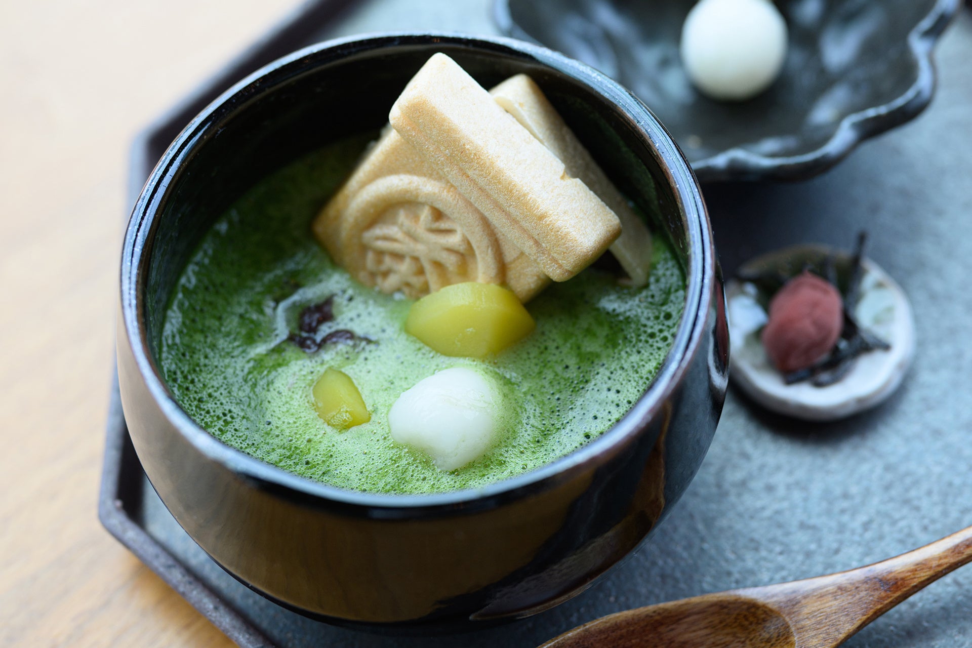 はじめは国産抹茶の豊かな香りや色合いを味わい、よくかき混ぜて小豆とともにお召しあがりください。白玉や栗などを自由にトッピングすれば、食感や風味の変化もお楽しみいただけます。たっぷりの小豆と栗をサンドした茶箱をかたどった最中もご用意。そのままはもちろん、ぜんざいに浸せば中の小豆がほどよく溶け合い、豊かな甘みと食べ応えをご堪能いただけます。塩昆布などのお口直しも添えておりますので、最後のひと口まで、ぜんざいの奥深い甘みと味わいをご満喫ください。