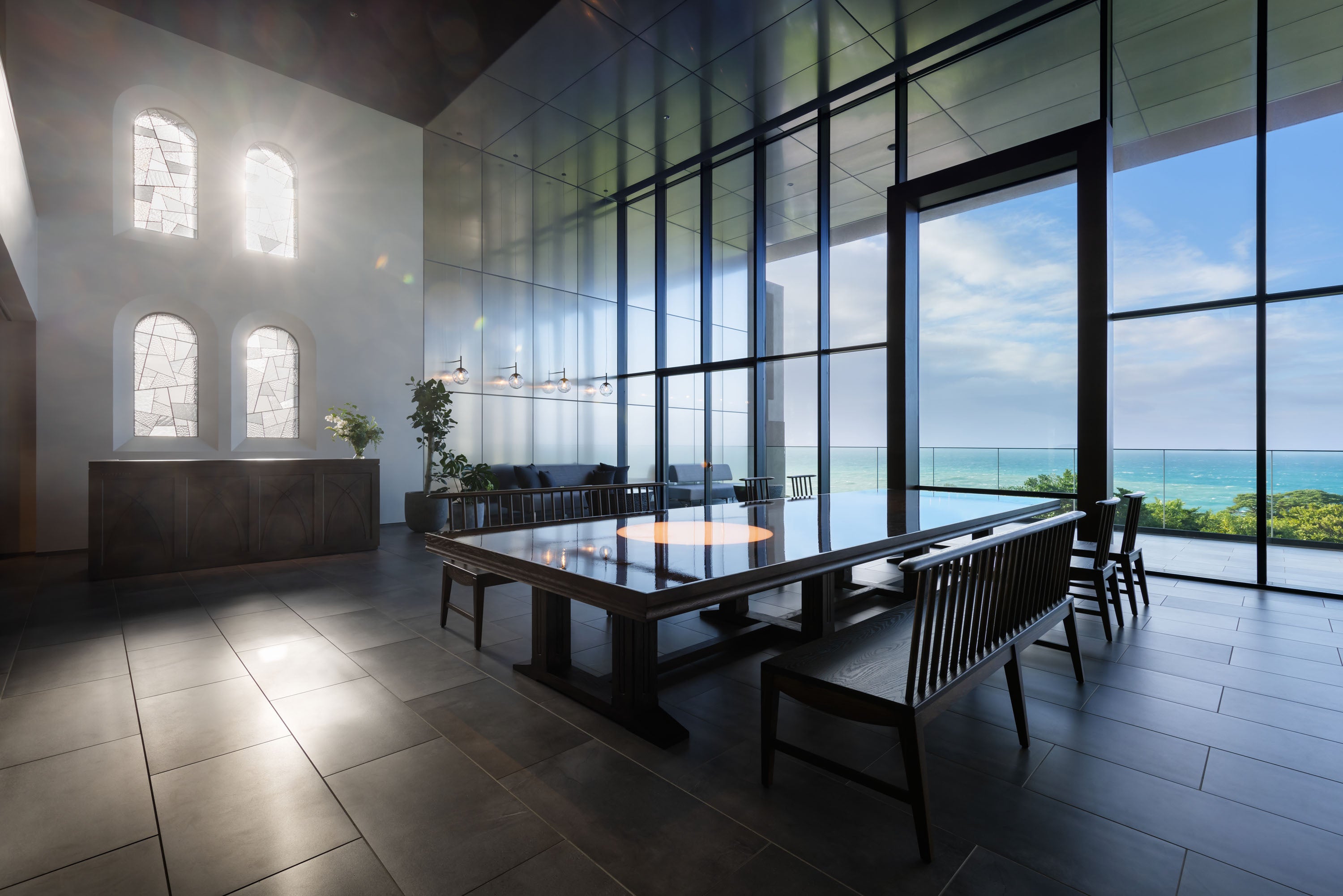 五島のシンボル「鬼岳」の噴火により形成されたとされる溶岩海岸を見下ろす高台に位置しています。内装設計とデザインを手がけた橋本夕紀夫氏がテーマに掲げたのは「The view」。どこまでも続く美しい海景、身体を包み込む海風。鐙瀬ならではのダイナミックで雄大な自然が主役となるようなデザインが、館内にちりばめられています。