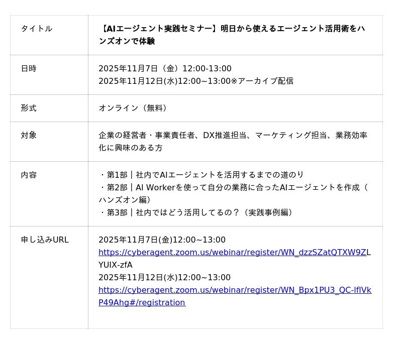 株式会社サイバーエージェント(本社:東京都渋谷区、代表取締役:藤田晋、東証プライム市場:証券コード4751)のグループ会社である株式会社AI Shift(本社:東京都渋谷区、代表取締役社長:米山結人、以下AI Shift)は、明日から業務で使える「AIエージェント」活用術を体験できる実践オンラインセミナーを開催いたします。