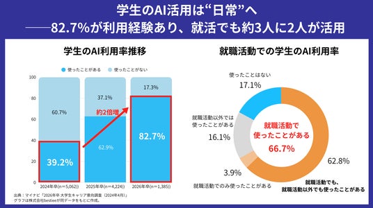 学生の生成AI利用は、ここ数年で一気に日常化しました。マイナビが2025年に実施した調査では「AIを利用したことがある学生」が2年前の約2倍となる82.7%、「就職活動でAIを活用した学生」も66.7%(約3人に2人)に上り、ChatGPTやGeminiといった生成AIの利用が授業・研究・就職活動の場面で急速に広がっています。
