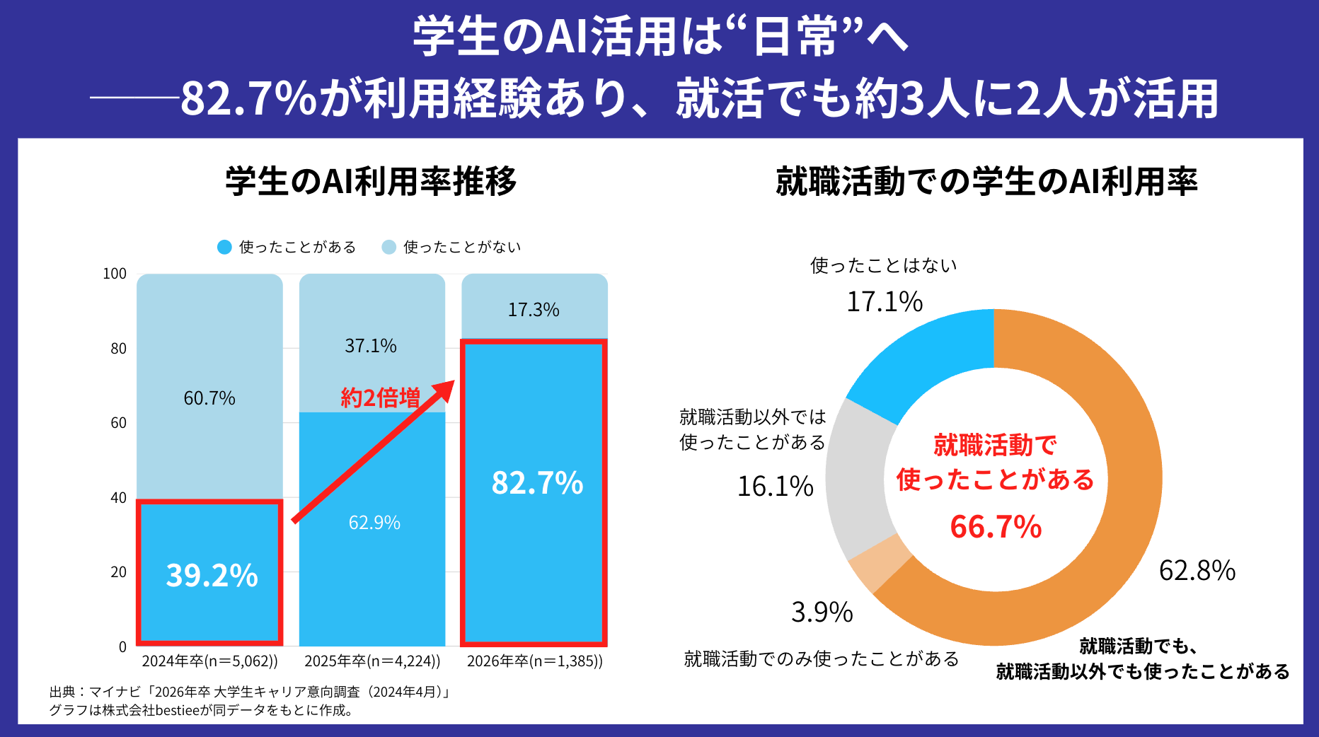 学生の生成AI利用は、ここ数年で一気に日常化しました。マイナビが2025年に実施した調査では「AIを利用したことがある学生」が2年前の約2倍となる82.7%、「就職活動でAIを活用した学生」も66.7%(約3人に2人)に上り、ChatGPTやGeminiといった生成AIの利用が授業・研究・就職活動の場面で急速に広がっています。