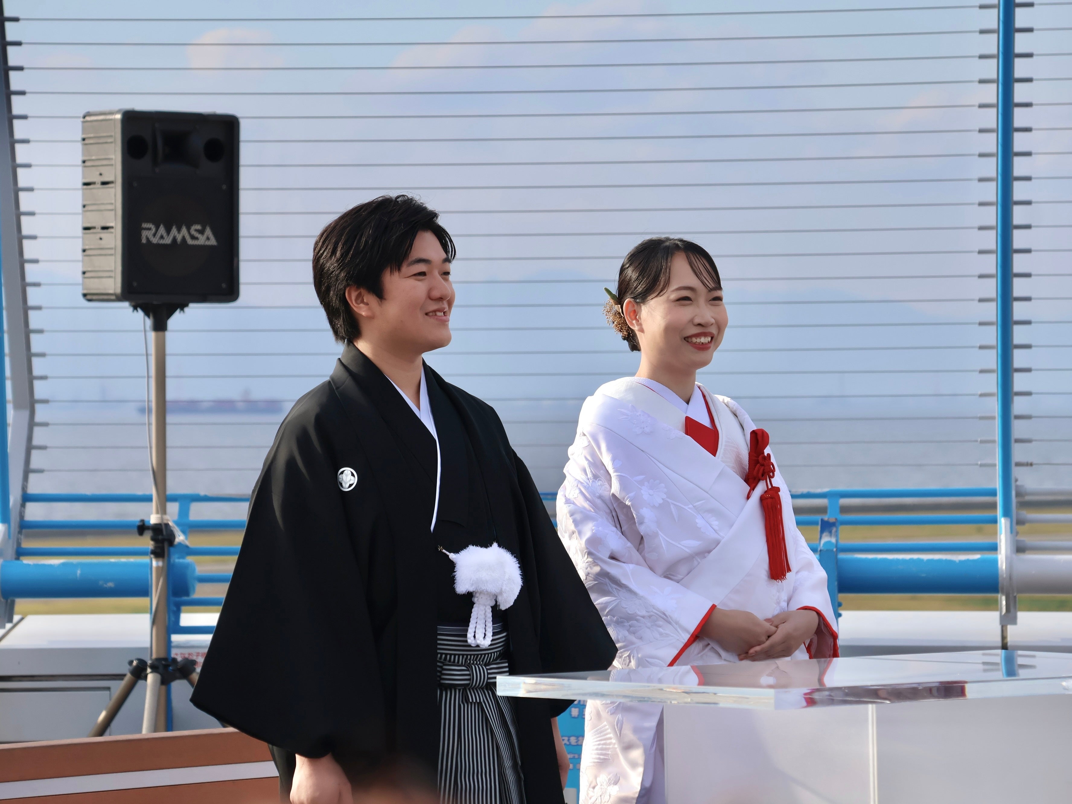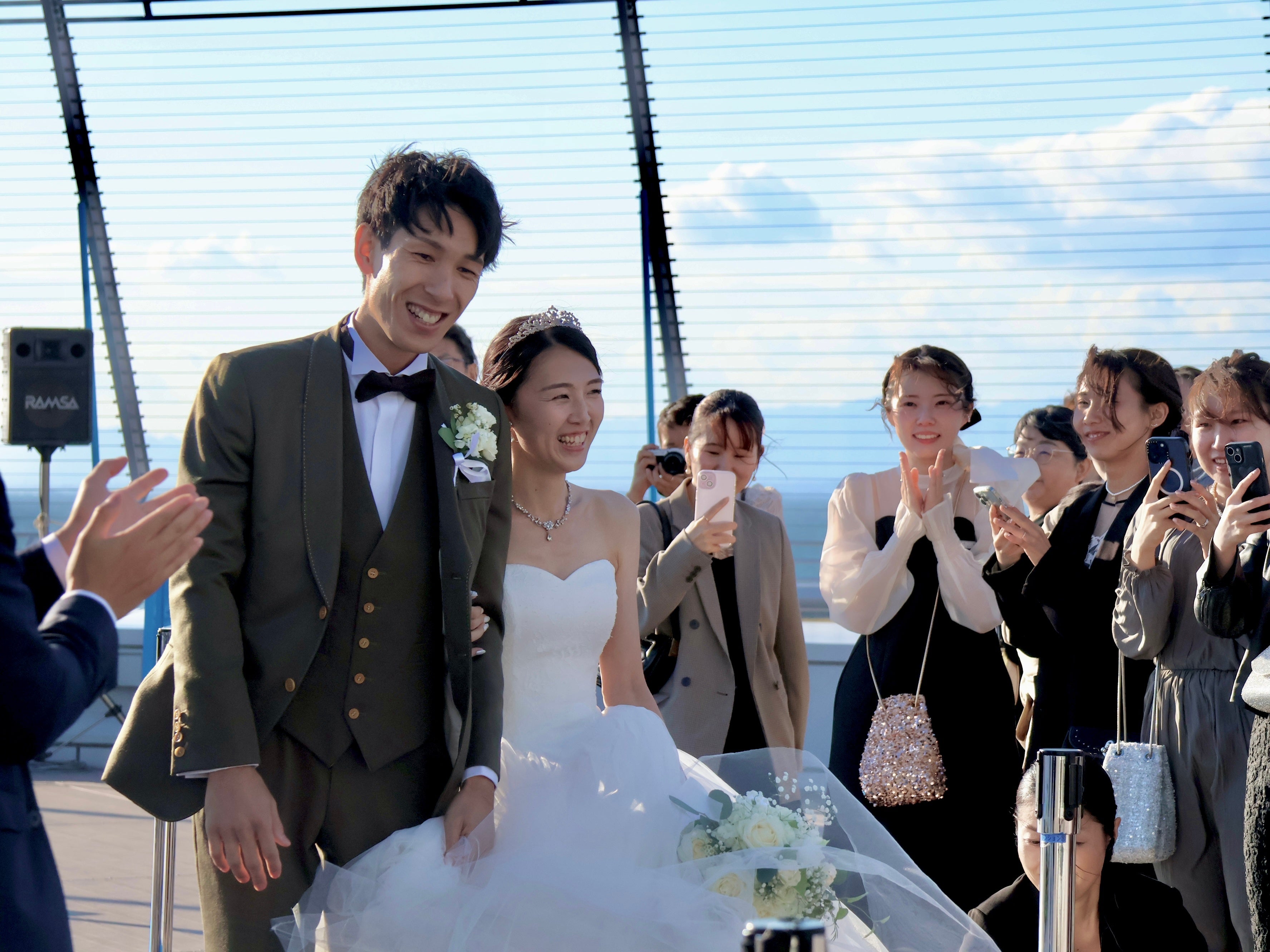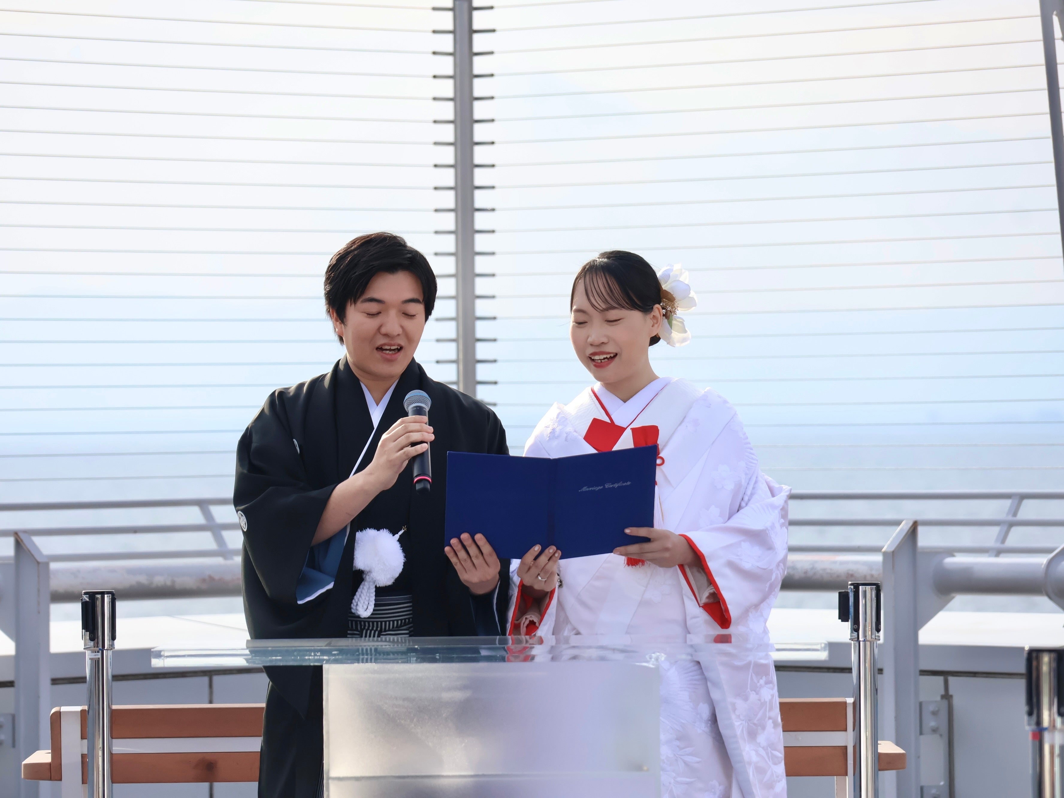 9月にはベトナムのご実家で挙式を済ませ、日本では和装での挙式を実施。スカイデッキ挙式としては初の和装セレモニーとなり、国際色豊かで温かみのある挙式となりました。