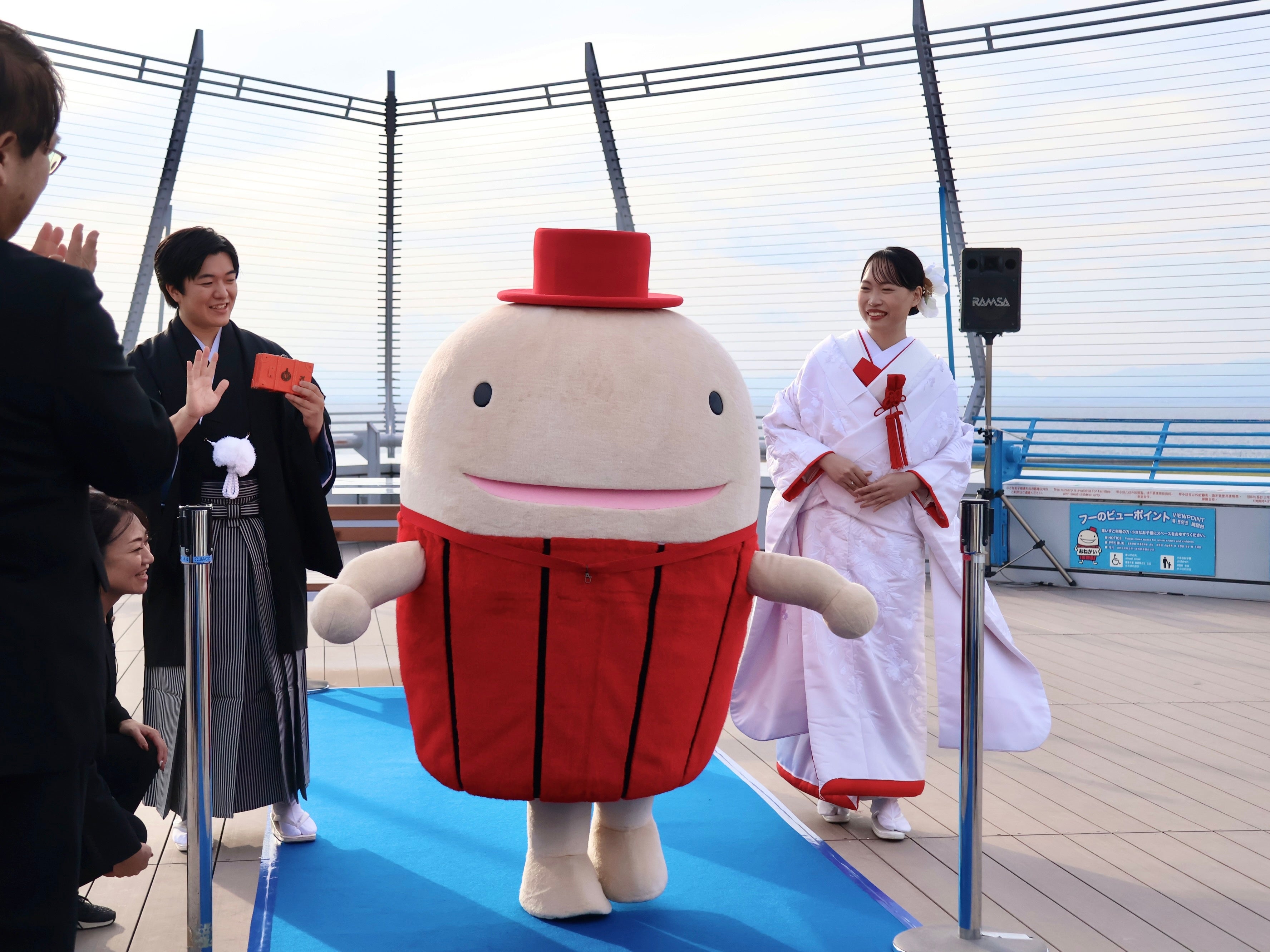管制塔を背景に新郎新婦が入場。誓いの言葉が述べられ、二人のもとに指輪を届けたのは、セントレアのオリジナルキャラクター「なぞの旅人フー」!首から指輪の入ったトランク型のケースを下げて指輪を届ける演出に、会場からは笑顔がこぼれました。