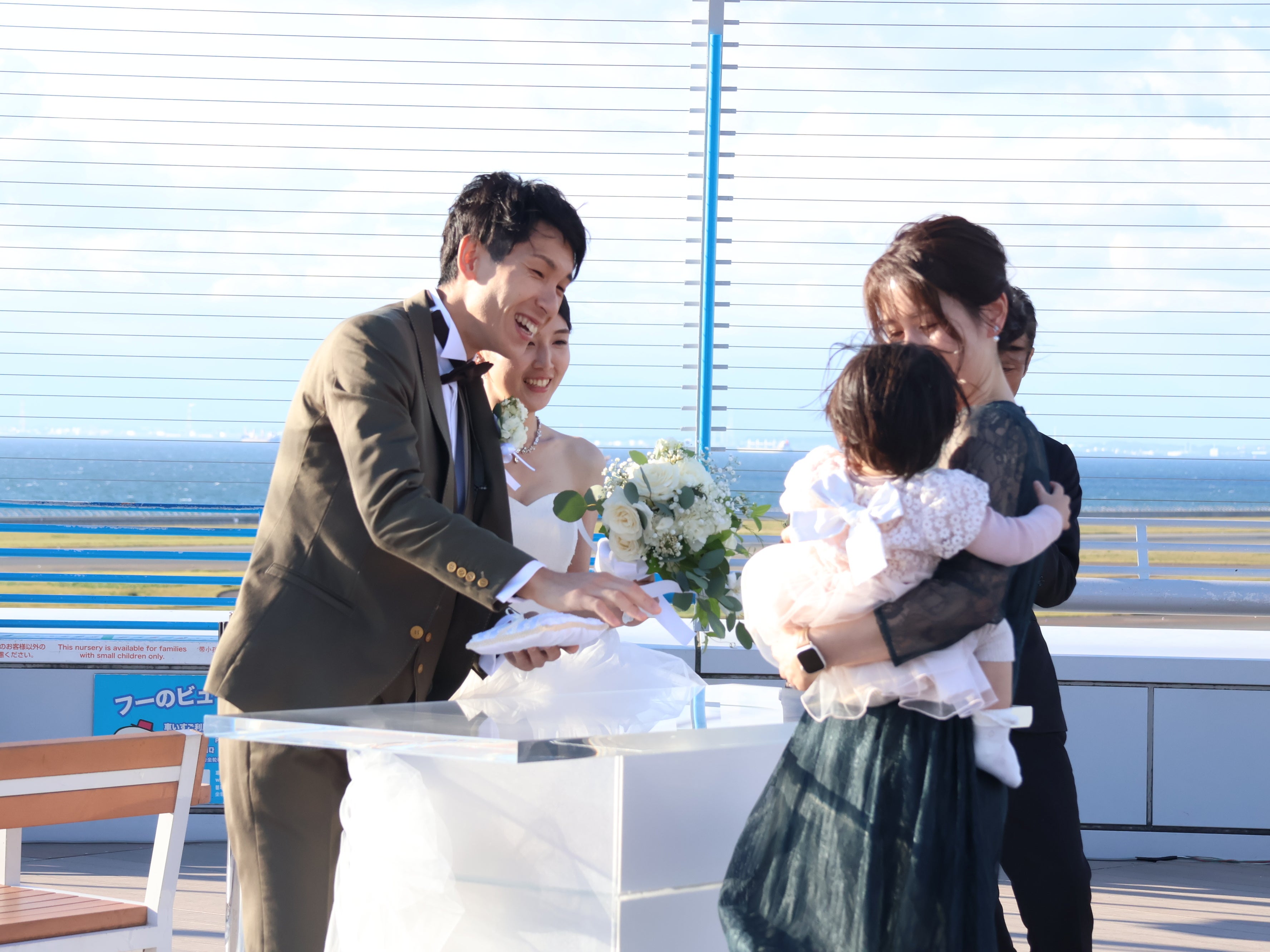 愛知県在住のご夫婦は、新婦様の希望でスカイデッキ挙式を選択。学生時代に国際交流を通じて空港に興味を持ち、飛行機に関わる仕事に就いた新婦様にとって、空港は特別な場所でした。