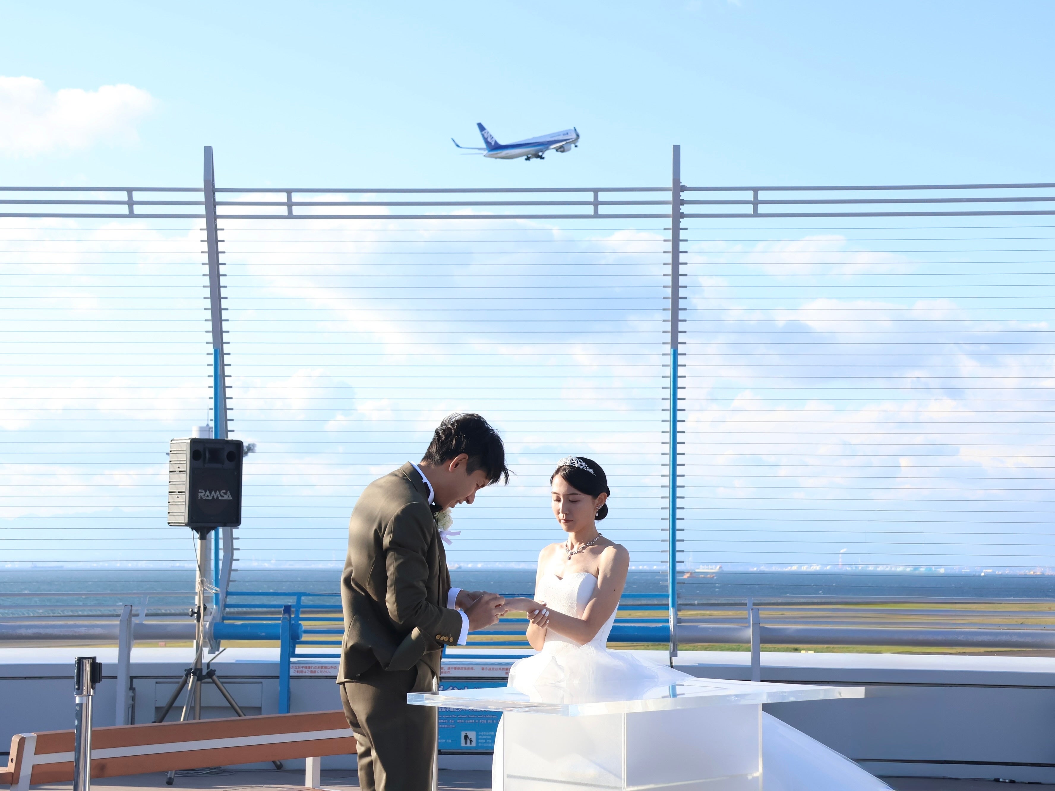 管制塔を背景に新郎新婦が入場。可愛いリングガールが登場し、二人のもとに大切な指輪を届けてくれました。指輪の交換をする二人の後ろでは、ちょうど飛行機が離陸。空港ならではの祝福がふたりの門出を彩りました。