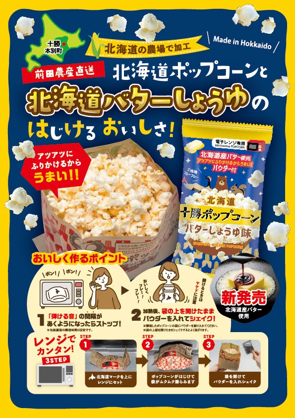 前田農産食品株式会社(本社:北海道中川郡本別町、代表取締役:前田茂雄)は、十勝産とうもろこしを使用した新商品「北海道十勝ポップコーン バターしょうゆ味 ~黄金のとうもろこし畑から~」を、10月1日(水)より全国で発売開始しました。