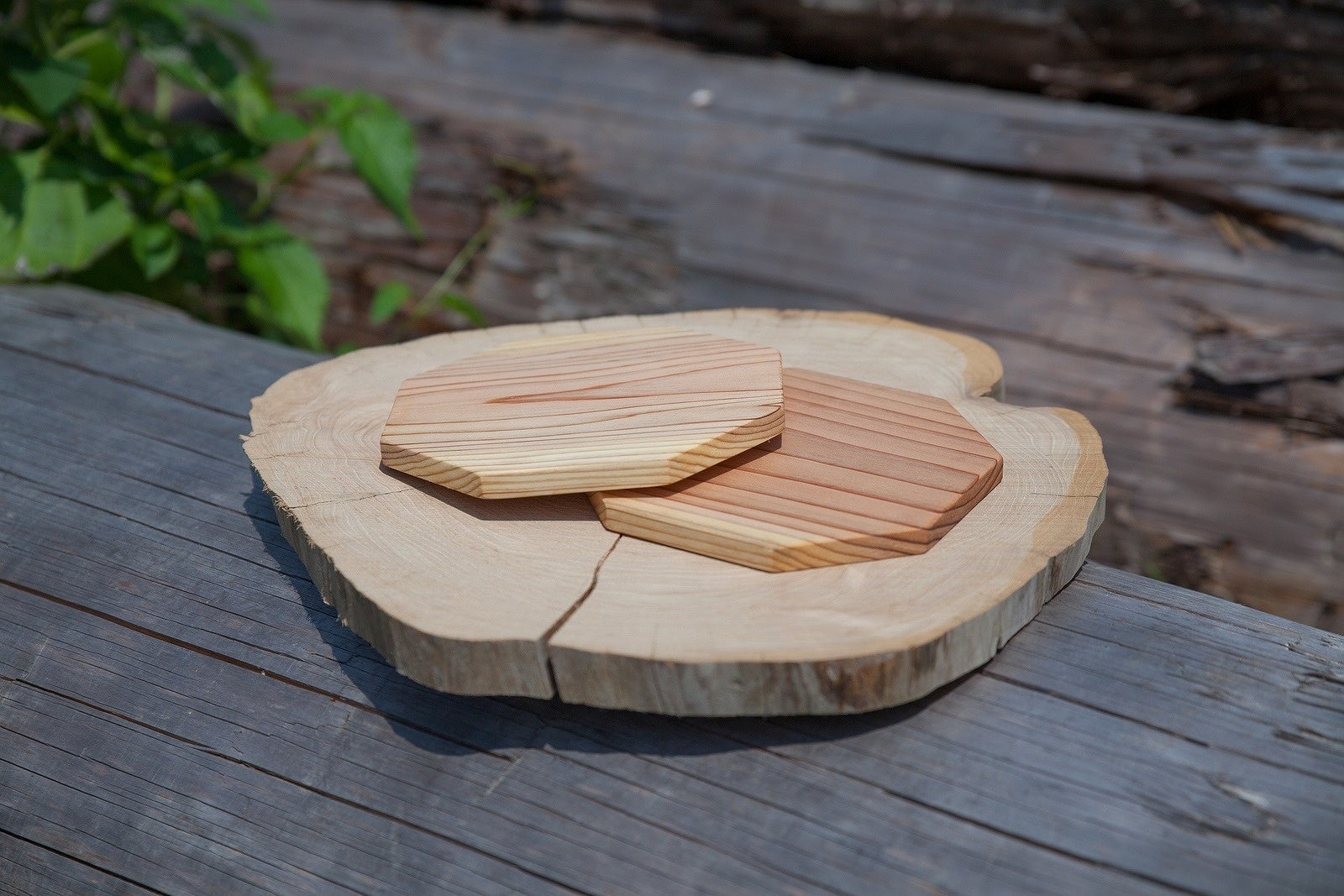 (夢木香)佐賀県産材の杉を使った八角形の鍋敷きは、木材の自然な温かみを食卓にプラスするアイテムです。