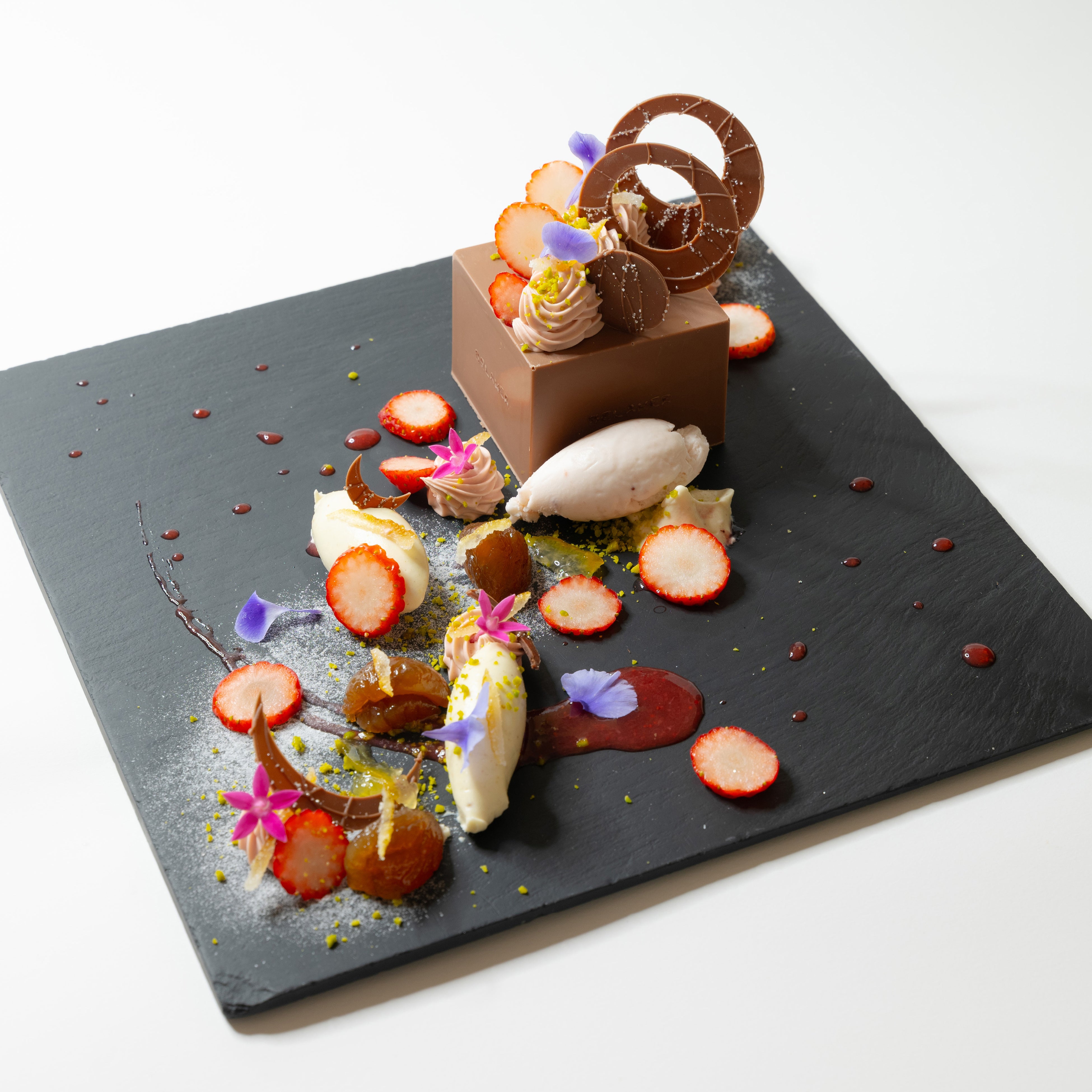 細かく刻んだピスタチオと食用花を添えて仕上げました。