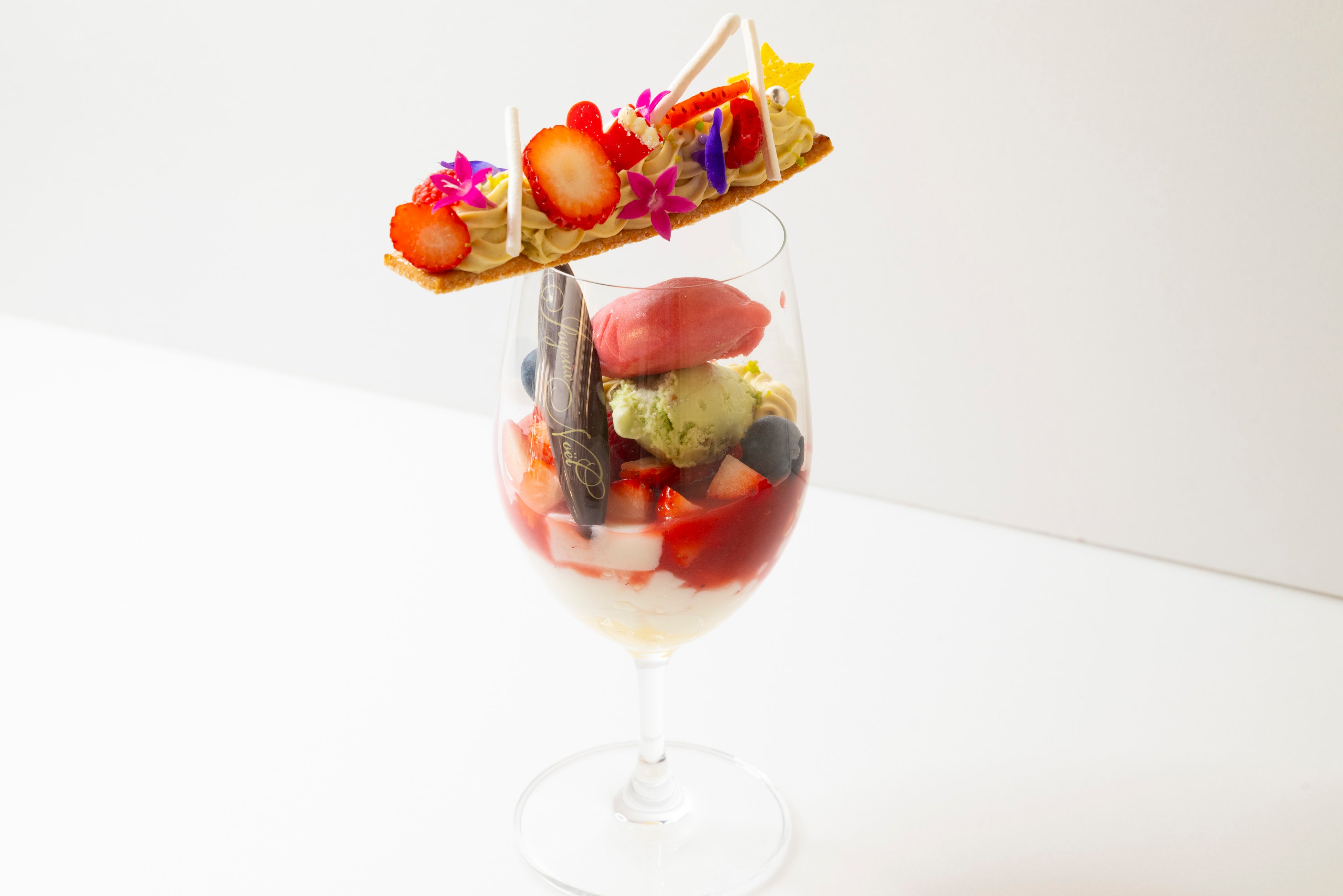 ミルクのジュレに国産あまおうのソース、ピスタチオとホワイトチョコのクリーム、フレッシュの苺、フランボワーズ、ブルーベリー、ピスタチオアイスとフランボワーズのソルベ。グラスの上に香ばしく焼いたサブレ生地、ピスタチオとホワイトチョコのクリーム、メレンゲ、クリスマスの装飾を型取ったチョコを飾って仕上げました。
