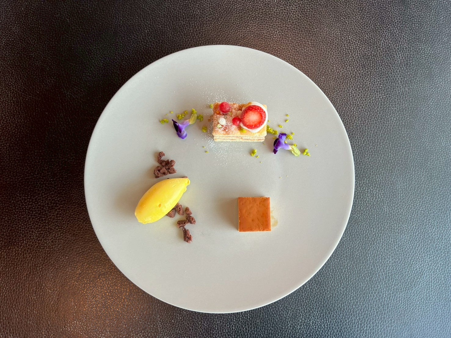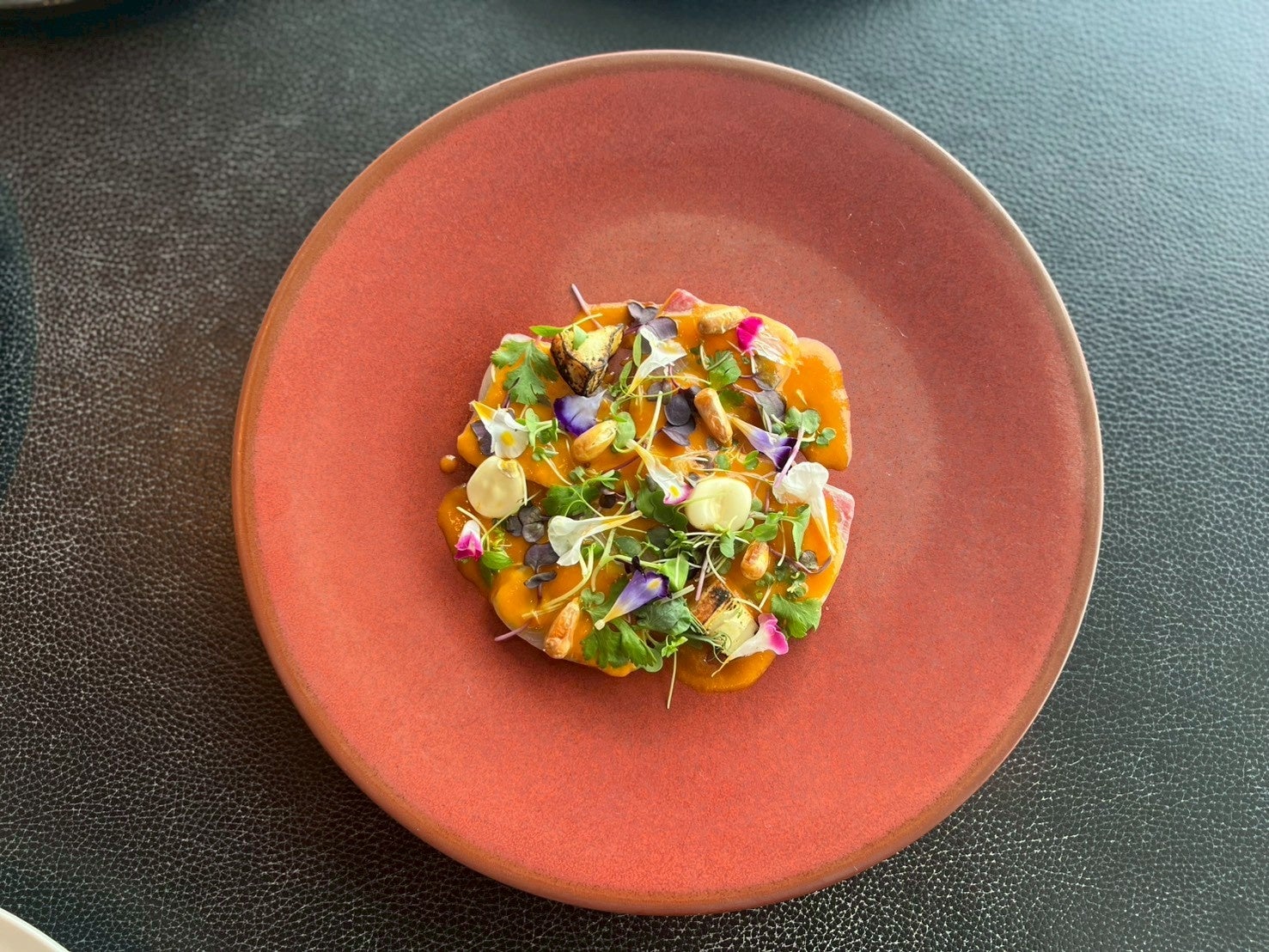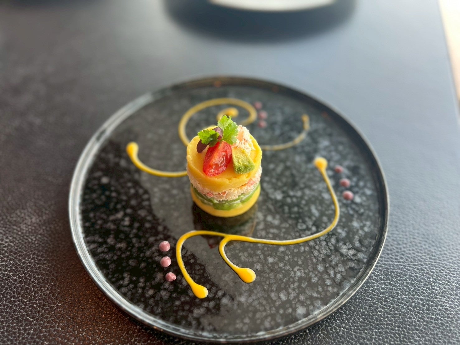 黄色い唐辛子やレモンで風味付けしたポテトベースに、アボカドやズワイガニなどを使用したケーキのような一品