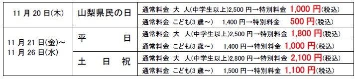 富士山が冠雪を迎え、秋の深まりを感じている山梨県民の皆さまも多いのではないでしょうか?そこでユネッサンは、山梨県民の皆さまを対象に秋旅行へのお出掛け意欲を後押ししたいと考え、11月20日(木)の山梨県民の日に合わせて「勝手に山梨県民割!」を実施いたします。