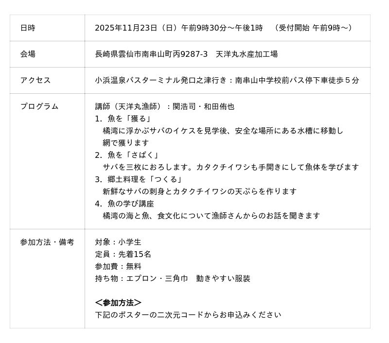 「日本さばける塾 in 雲仙」では、近年の海洋環境の変化にともない、一昨年・昨年と赤潮で甚大な被害が生じた橘湾において、魚を獲るだけでなく養殖や加工により漁業の価値を高め未来を創造する(株)天洋丸と連携し、様々な海の学びを得るプログラムです。実際に養殖サバのイカダに移動し、煮干しを与えて活き活きと躍動するサバを見て網ですくう体験をしてもらいます。またそのサバを自分でさばいて海の豊かさ魚食文化の奥深さを味わい、地元の海の素晴らしさを学んでいただきます(郷土料理:自転車飯やカタクチイワシの天ぷらなども予定)。