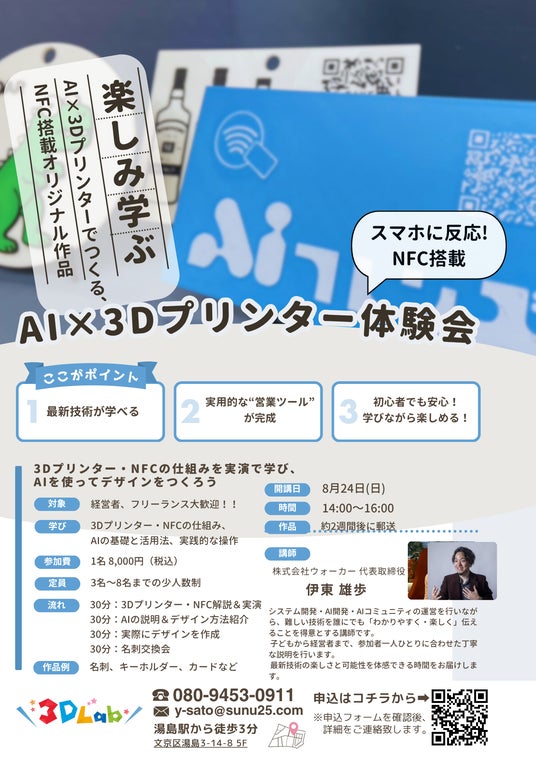 株式会社ウォーカー(本社:東京都文京区、代表取締役:伊東雄歩)の運営する3DLabは、AIと3Dプリンター、そしてNFCチップを活用し、誰でも簡単に“スマホでリンクが開く”オリジナル名刺を作れる最先端のものづくりワークショップ『AI×3Dプリンタ体験会』を開催致します。