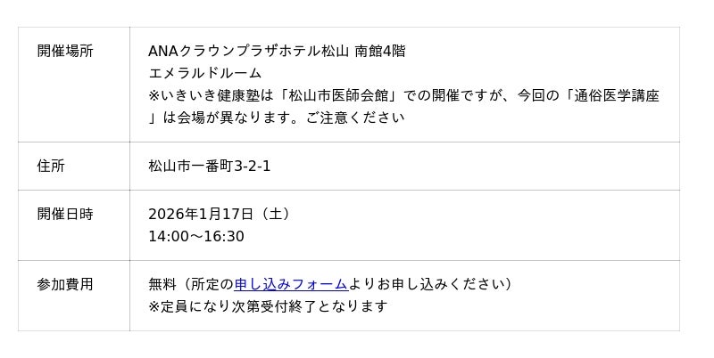 松山市医師会主催の「第70回 松山市通俗医学講座」2026年1月17日(土)に開催決定!