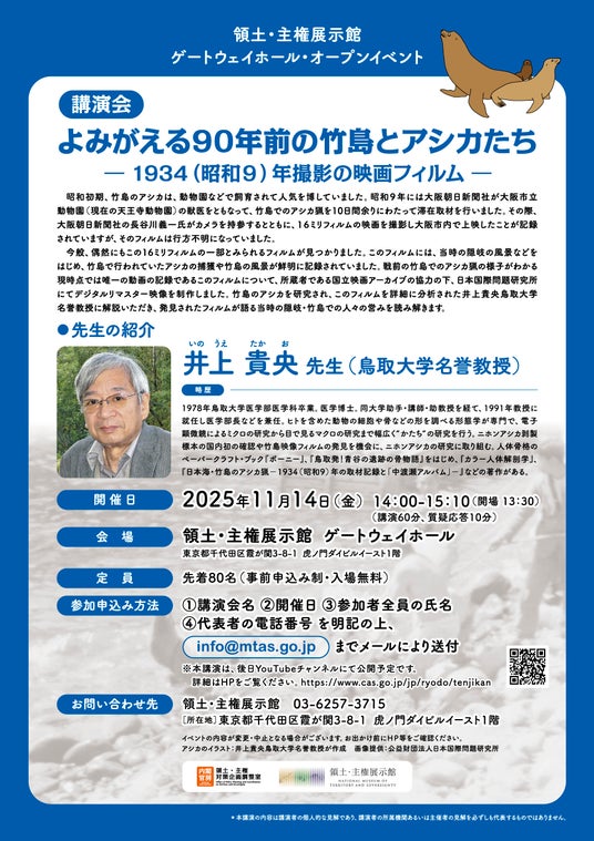 領土・主権展示館のゲートウェイホール・オープンイベントで「よみがえる90年前の竹島とアシカたち― 1934(昭和9)年撮影の映画フィルム ―」と題し、井上貴央鳥取大学名誉教授が講演を行います。このイベントは2025年11月14日(金)に領土・主権展示館ゲートウェイホールで開催され、内閣官房 領土・主権対策企画調整室が主催します。竹島のアシカを研究され、このフィルムを詳細に分析された井上貴央鳥取大学名誉教授に解説いただき、発見されたフィルムが語る当時の隠岐・竹島での人々の営みを読み解きます。