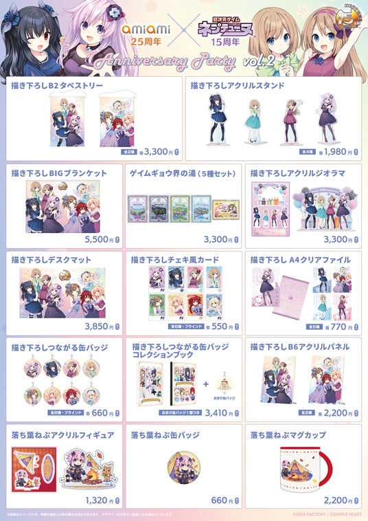 『あみあみ25周年×ネプテューヌ15周年 ダブル周年コラボレーション』が開催。イラストレーター「つなこ」先生描き下ろしイラストを使用したグッズを販売。